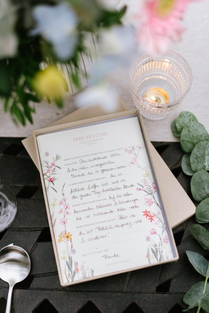 Auf dem Tisch greifen Banderolen für die Servietten und die Menükarten den Look auf. Jeder Gast erhält eine Postkarte mit einem persönlichen Willkommensgruß – eine tolle und liebevolle Überraschung!