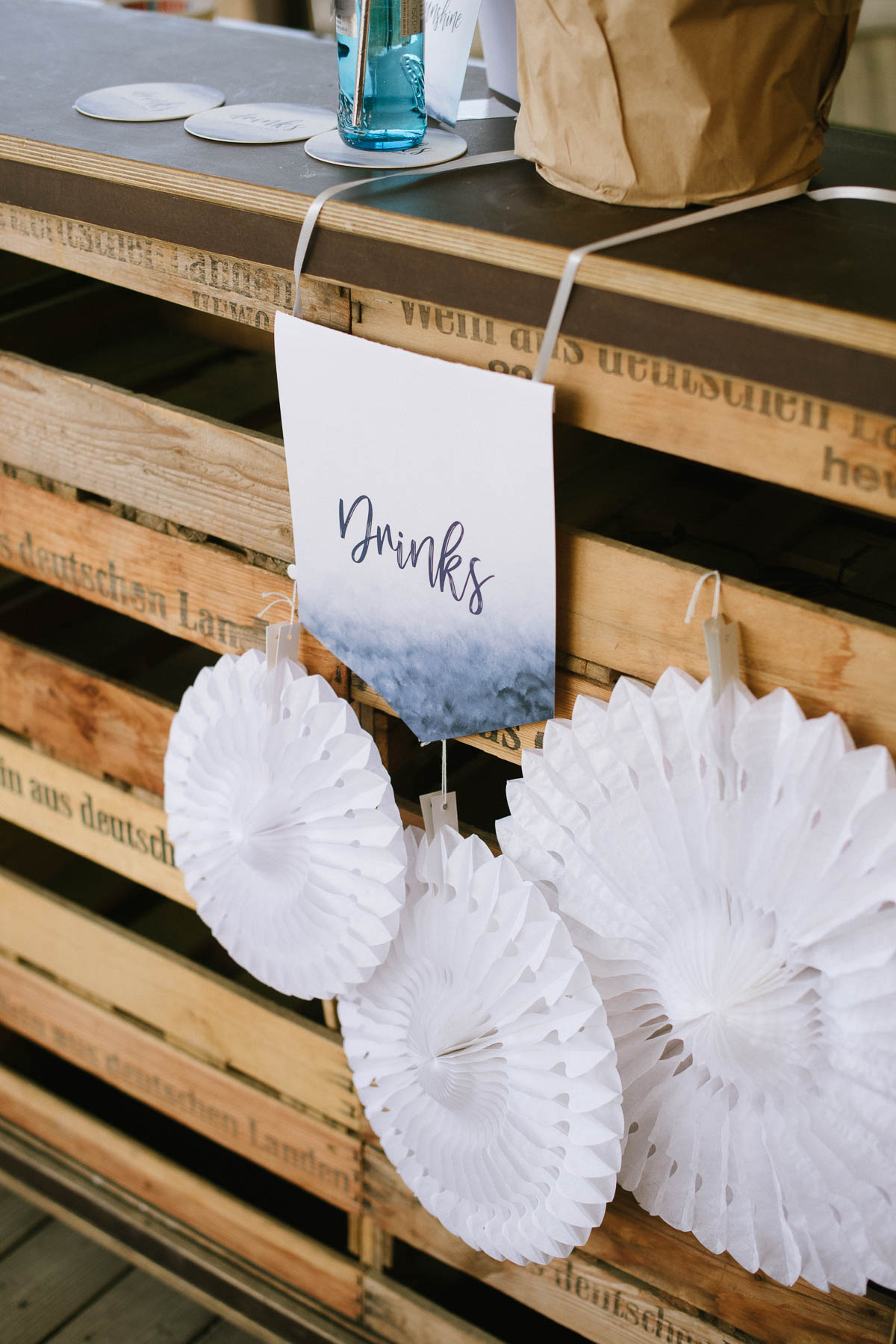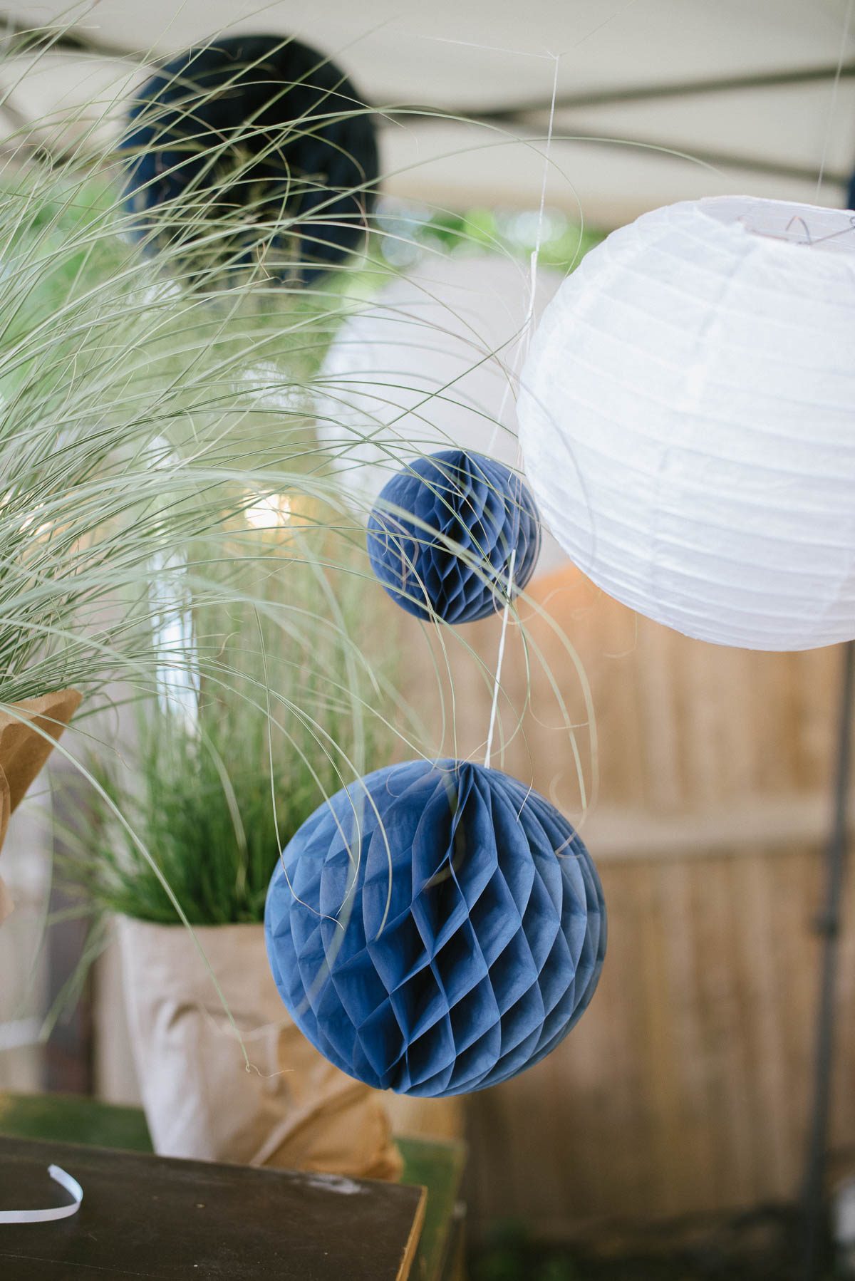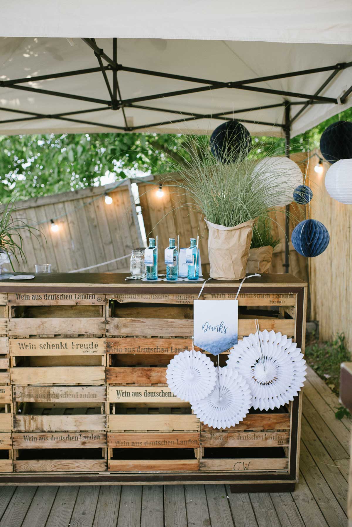 Die tollen, blauen Wabenbälle passen hervorragend zum Look! Weiße Lampions gehören ebenso dazu wie weiße Faltrosetten, die sich besonders an Wänden oder anderen ebenen Flächen gut drapieren lassen (und auch mal eine weniger schöne Ecke verstecken).