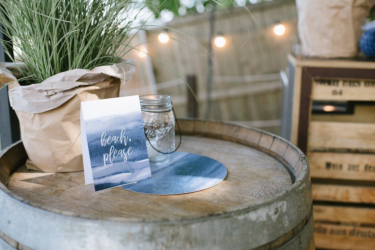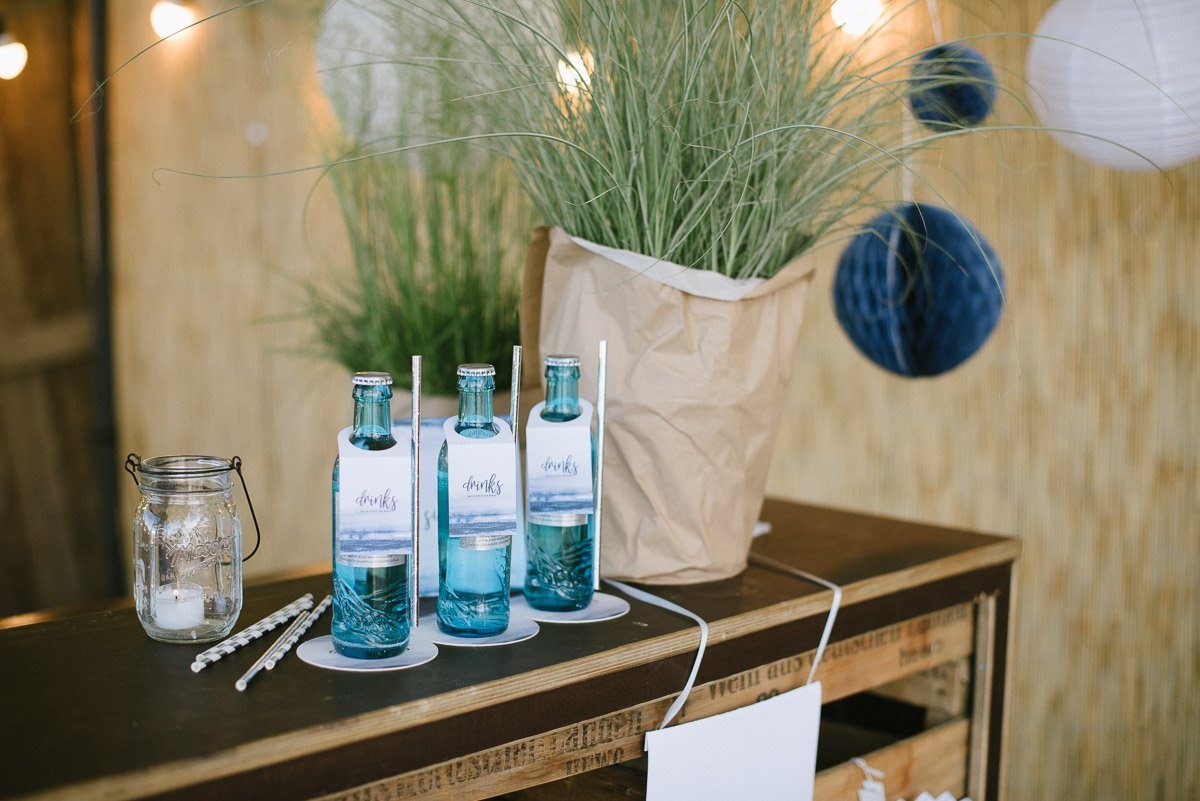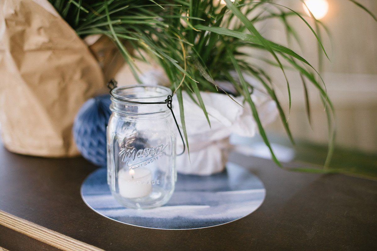 Sie bilden die Basis für die Dekoration. Ein Aussteller mit einem stimmungsvollen Spruch unterstreicht das Beachfeeling. Hinzu kommen einige Gräser in Töpfen, die man später auch prima den Gästen als Erinnerung mit nach Hause geben kann. Kerzen dürfen natürlich auch nicht fehlen. Die Mason Jar Gläser zum Aufhängen eignen sich perfekt als Windlichter.