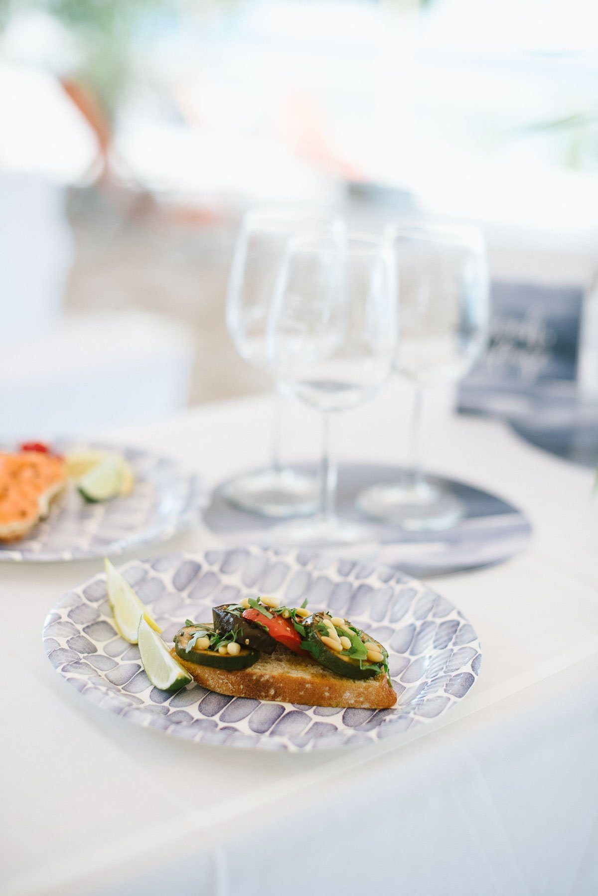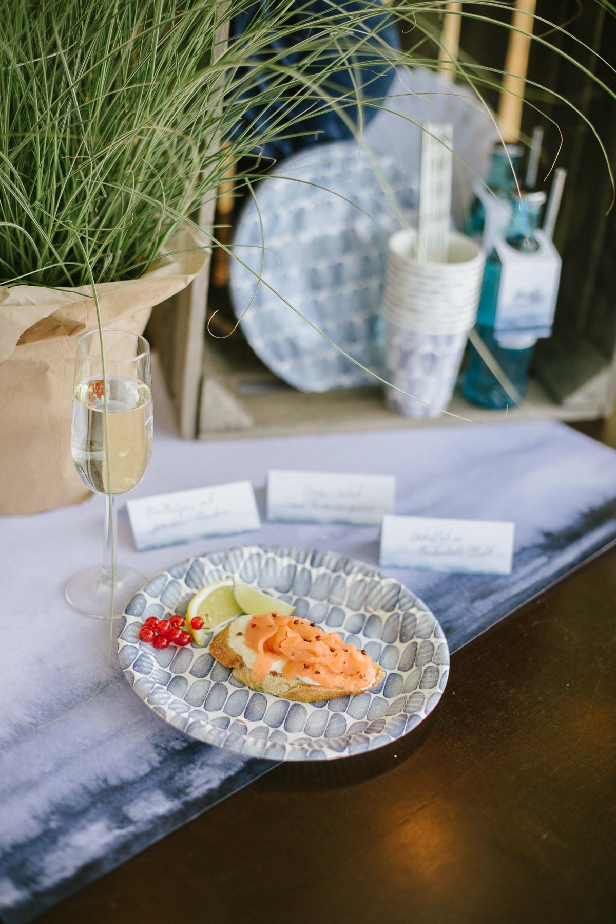 Lässig und dennoch stilvoll soll die Beachparty im Sylt Look aussehen. Auf den Tischen gruppieren sich daher die runden Platzsets mit aquarelliertem, blauen Muster. Deckt man formeller ein, liegen sie auf jedem Platz. Entscheidet man sich für eine eher freie Sitzordnung, verteilt man sie einzeln auf Stehtischen oder bildet mit drei Platzsets kleine Gruppen auf Biertischen.