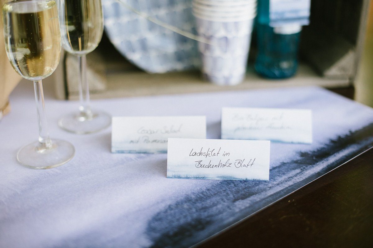Bar und Buffet werden mit Wimpeln im Beachparty Look gekennzeichnet. Apropos Buffet: Salate und anderen Speisen lassen sich mit den kleinen Schildchen benennen, damit jeder direkt die Köstlichkeiten erkennt. Alternativ dienen die Aussteller auch als Namensschilder am Tisch!