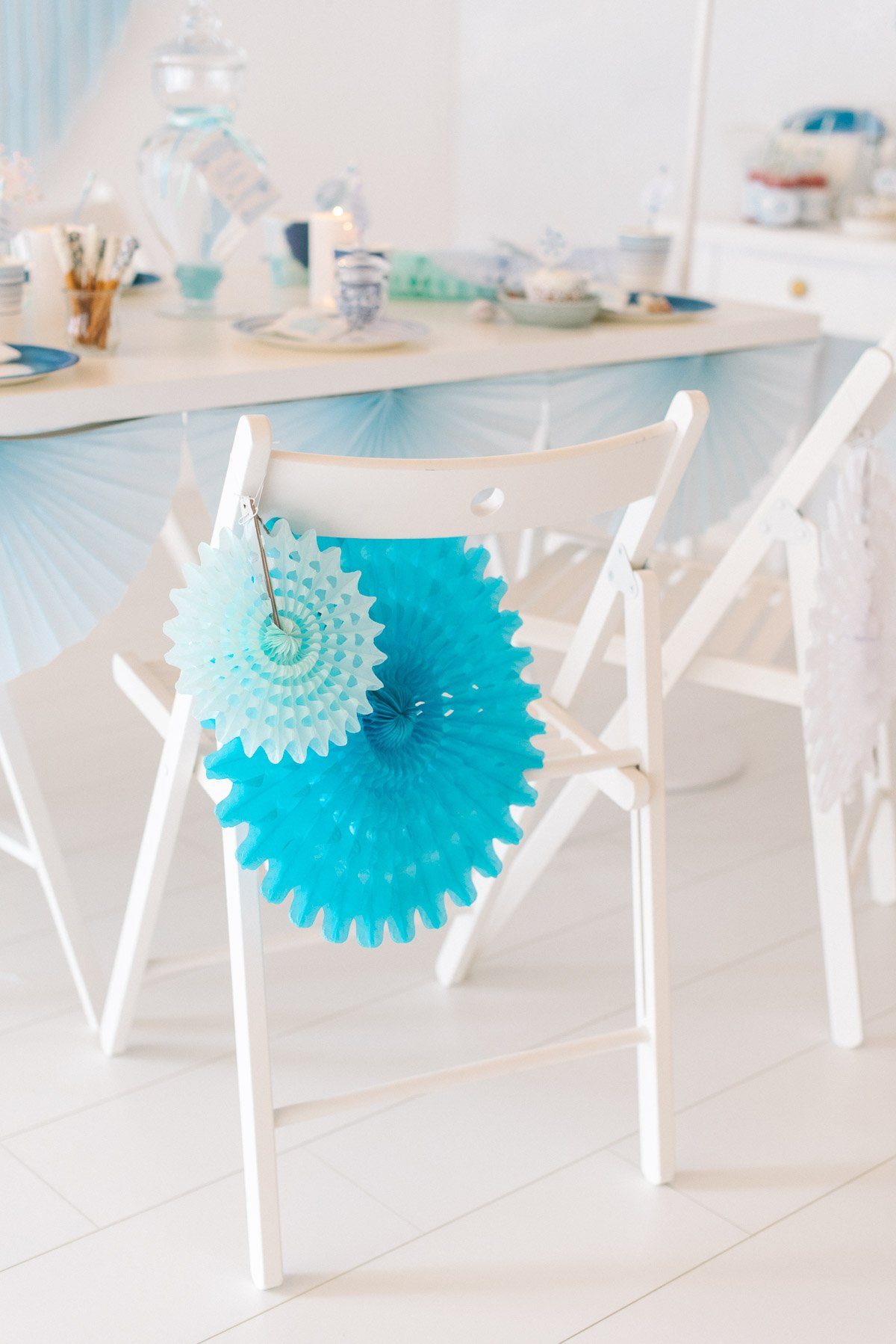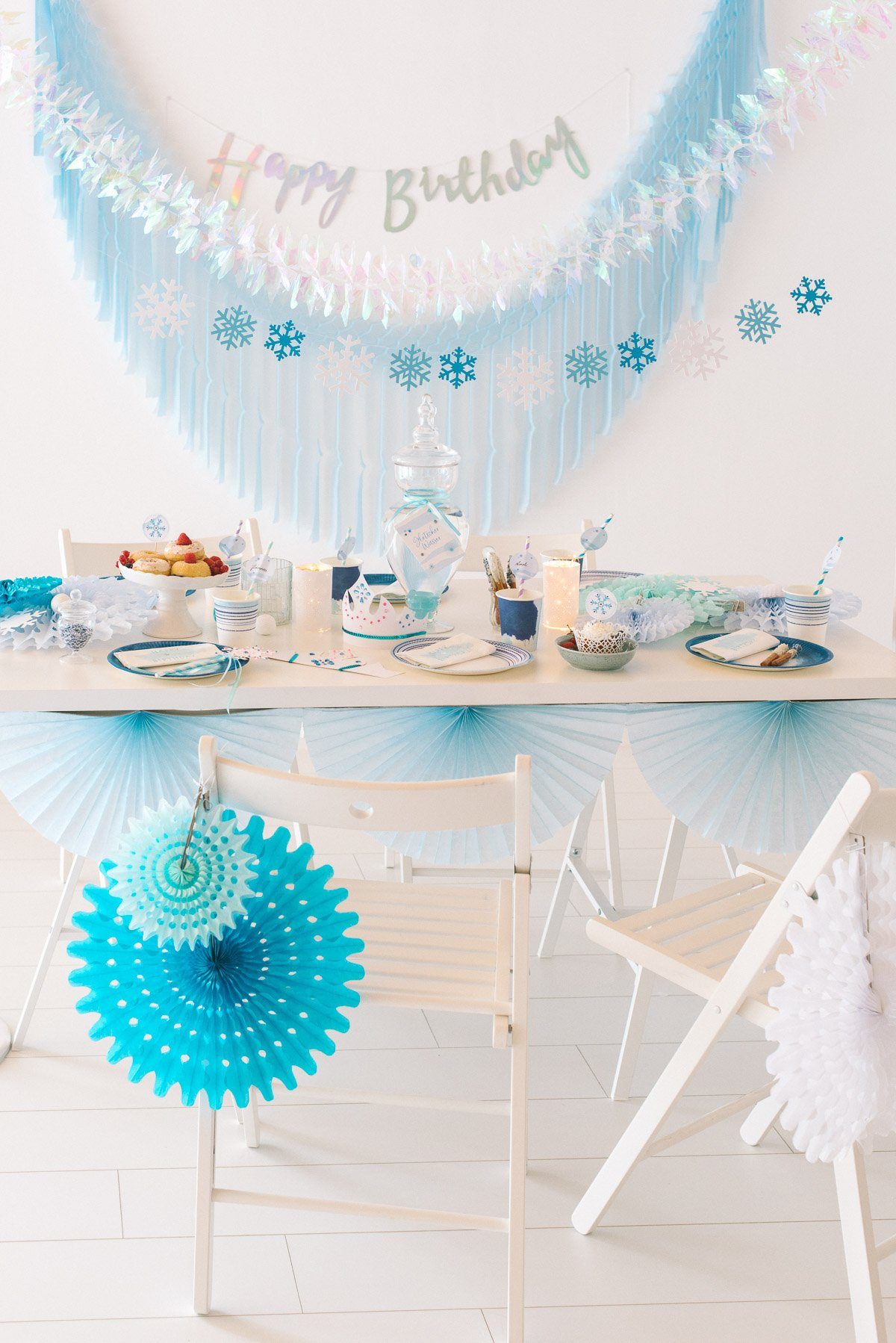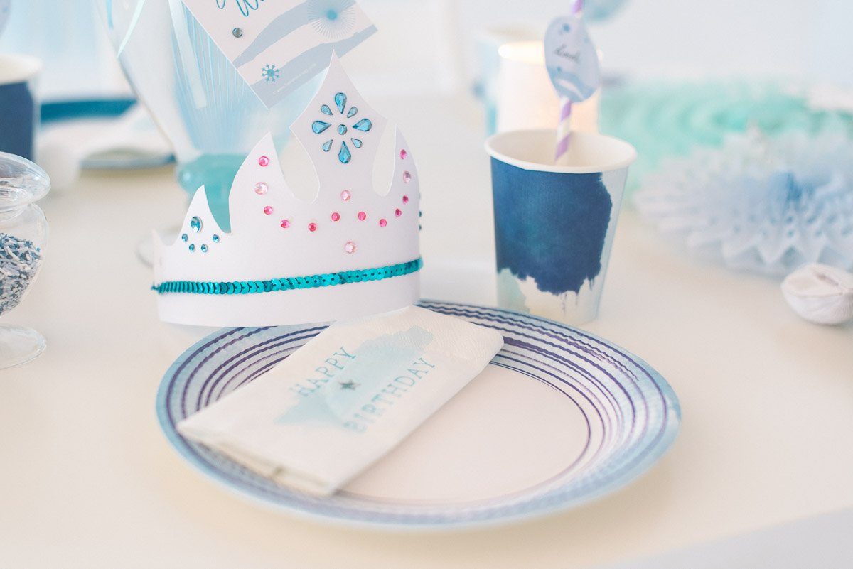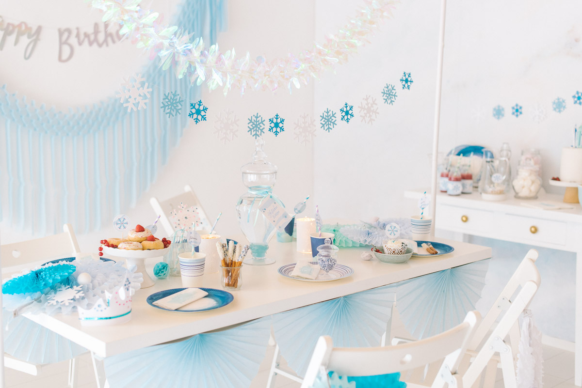 Schneeflocken, Eiskristalle und glitzernde Accessoires – die Dekoration und der Geburtstagstisch erinnern an Elsas Eispalast! Unterschiedliche Blau- und Aquatöne treffen auf Schneeweiß und einen Funken Lila.