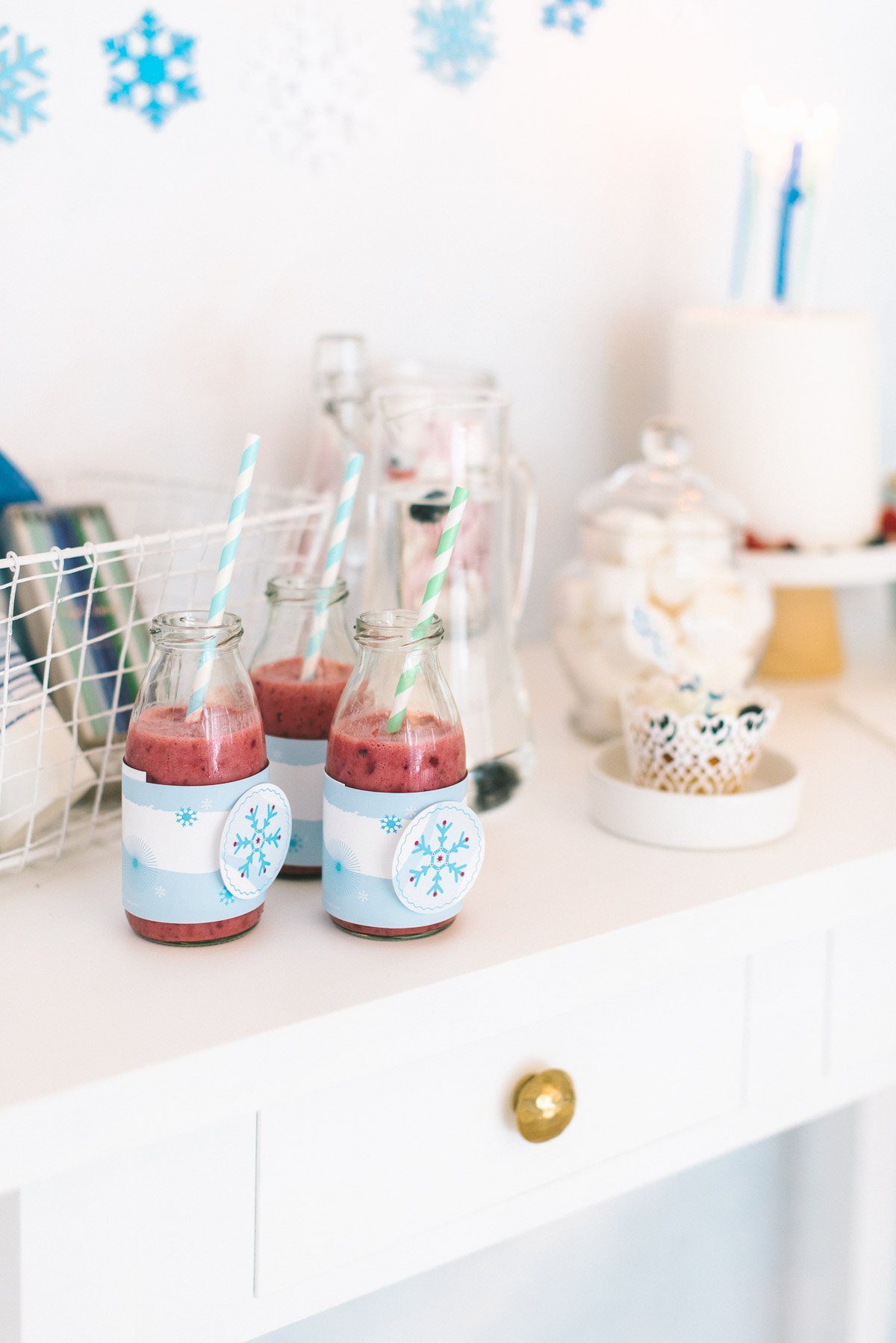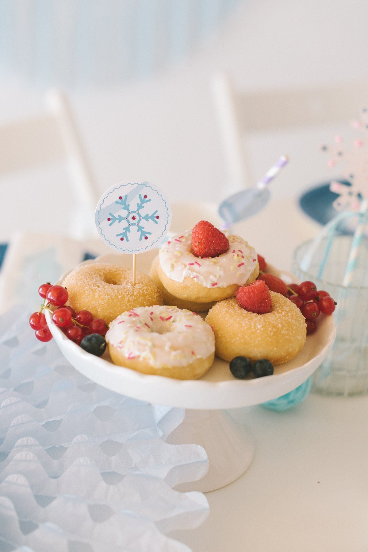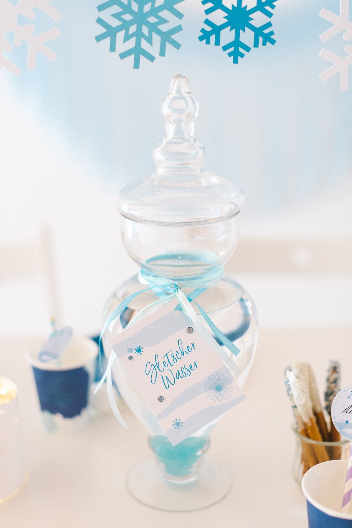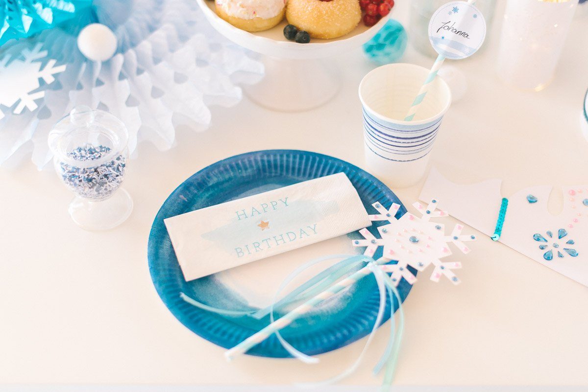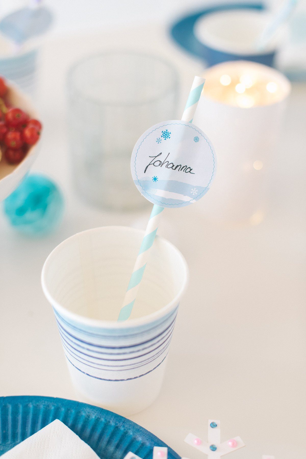 An den Papierstrohhalmen sind Aufkleber mit den Namen der Gäste angebracht. Die Aufkleber und die Servietten sind Teil der Frl. K Geburtstagsbox zum Thema Eisprinzessin.