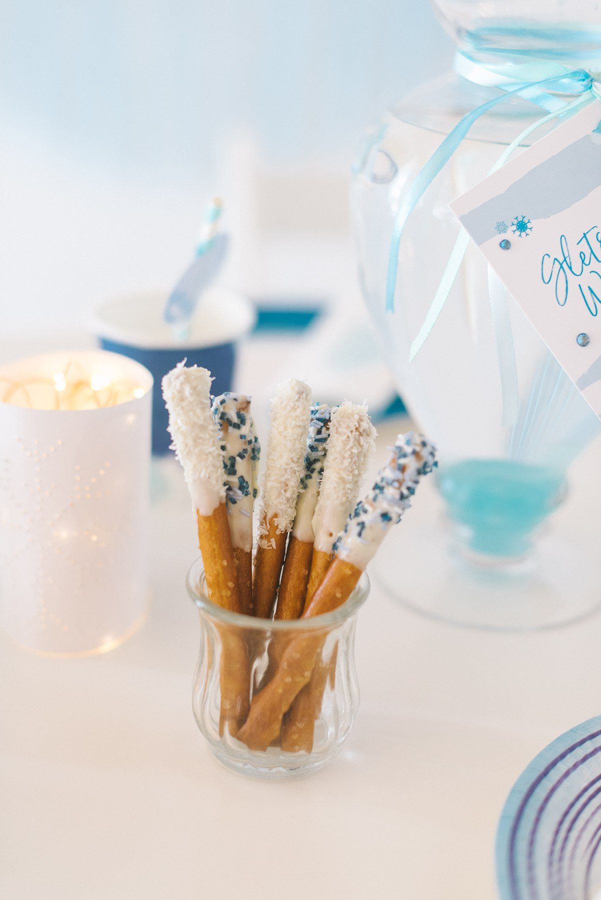 Süße Leckereien dürfen auf der Tafel der Eisprinzessin natürlich auch nicht fehlen! Wie wäre es mit den knusprigen Eiskristallsticks? Die sind kinderleicht herzustellen: einfach die Spitzen von dicken Salzstangen in weiße Kuvertüre tauchen und anschließend mit Glitzerzucker bestreuen.