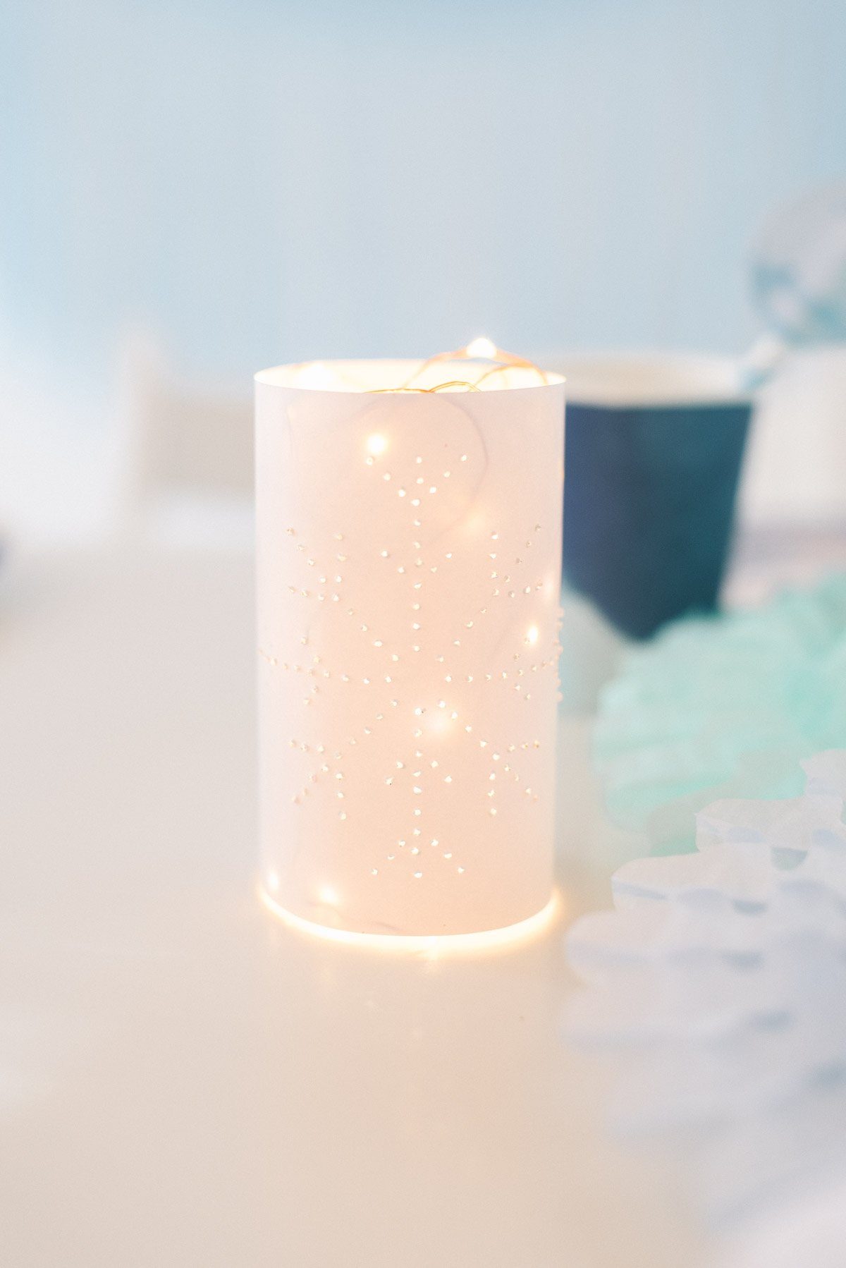 Ebenfalls in der Geburtstagsbox enthalten sie die Banderolen für Teelichter, deren Muster mit einer Nadel durchstochen wird. Durch die Löchlein der Schneeflocken fällt anschließend das Licht. Wem Kerzen zu heikel sind, der greift zu kleinen Lichterketten mit Batterien.