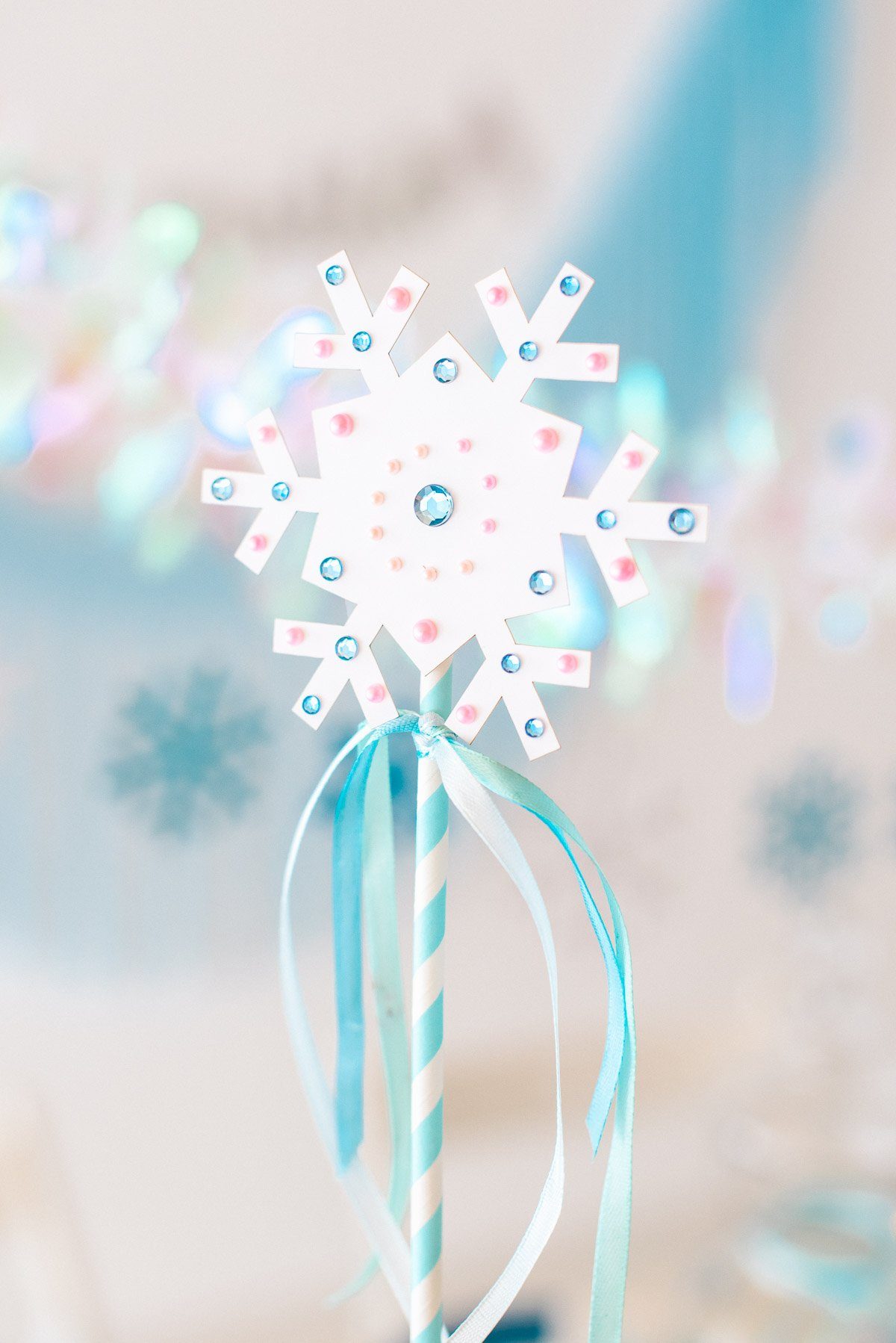 Für den Zauberstab werden die mitgelieferten Eiskristalle mit Glitzerkleber*, selbstklebenden Strassteinen*oder Pailettenbändern (*Affiliate) verschönert. Anschließend die Kristalle mit etwas Heißkleber auf die Papierstrohhalme kleben und farbige Satinbändern daran befestigen.