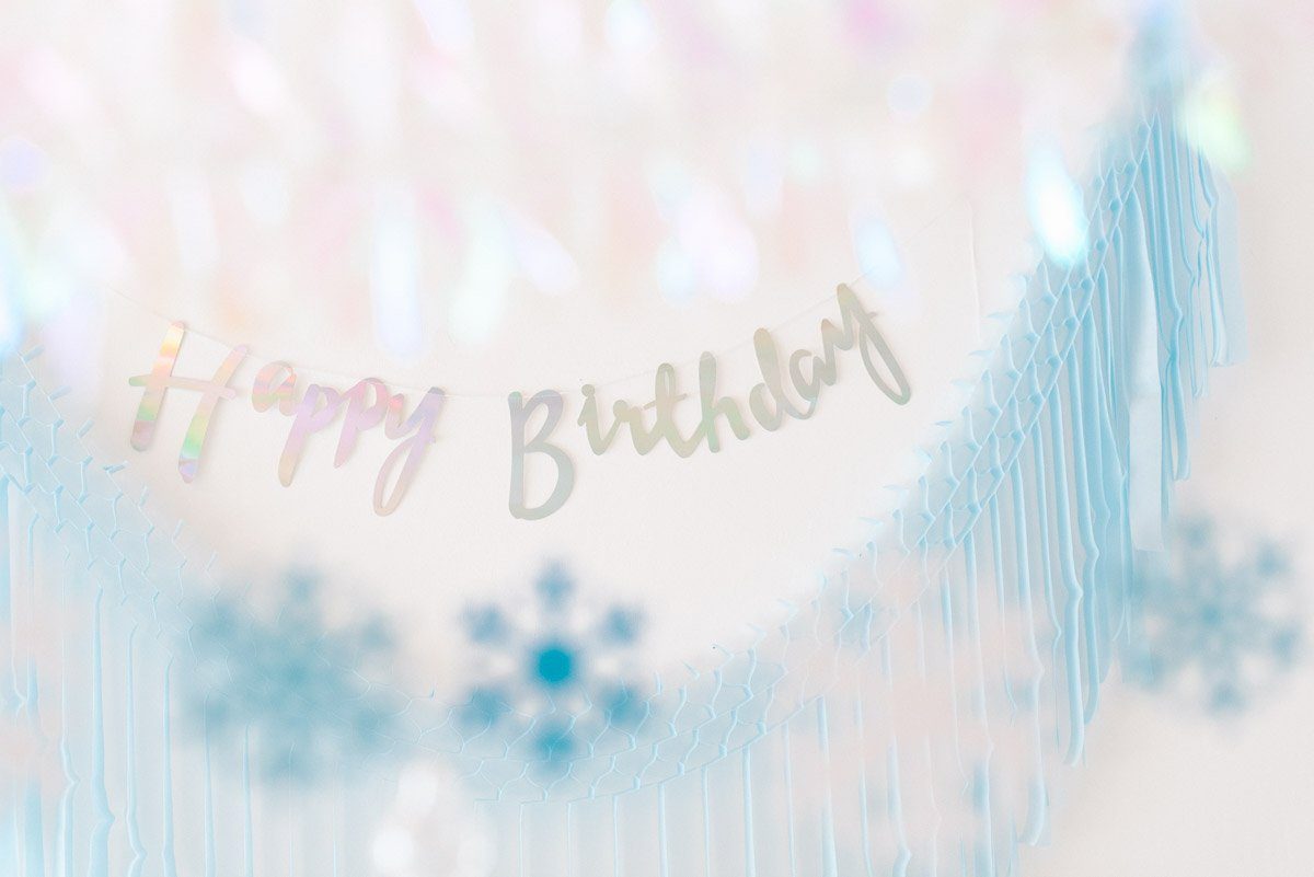 An der Wand schimmert die irisierende Happy Birthday Girlande, die von einer himmelblauen Fransengirlande unterstrichen wird.