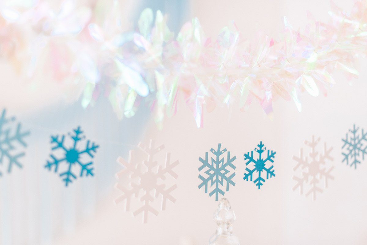Eine Girlande aus unterschiedlichen Schneekristallen ist über dem Tisch gespannt und sorgt für einen hübschen Hingucker.