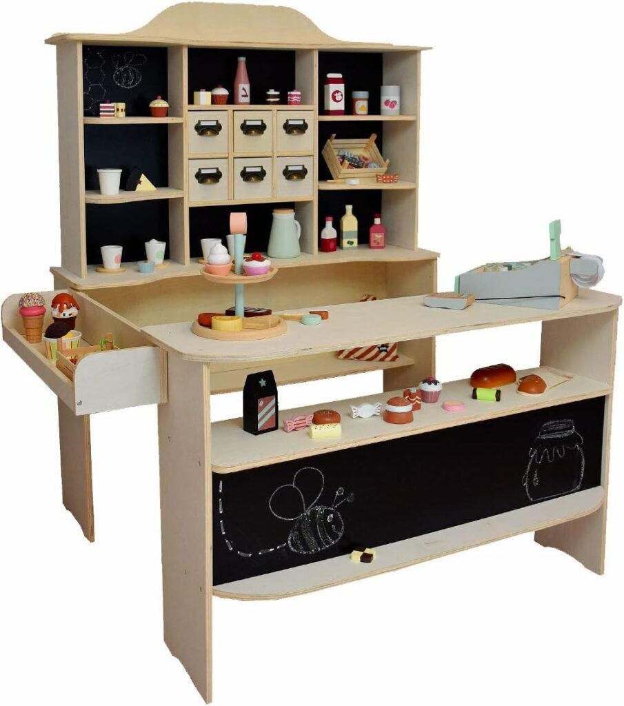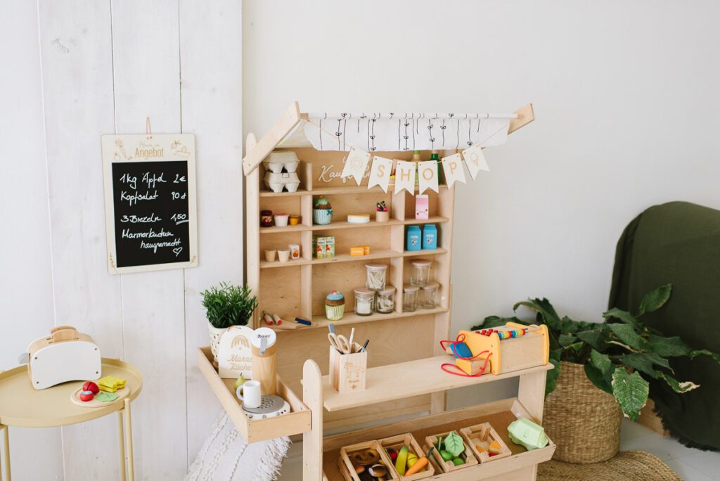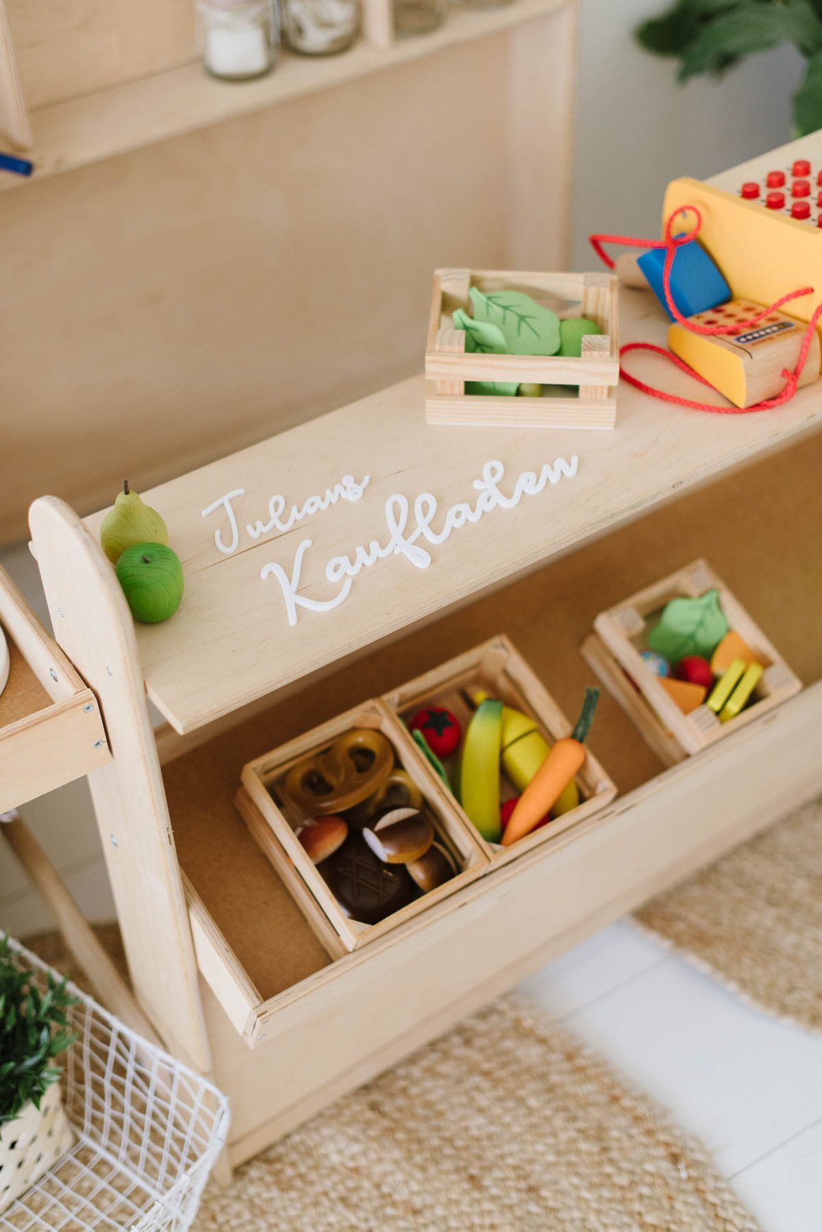 Mit dem personalisierten Kaufladenzubehör aus Holz oder Acryl wird daraus der ‘erste eigene Laden’.