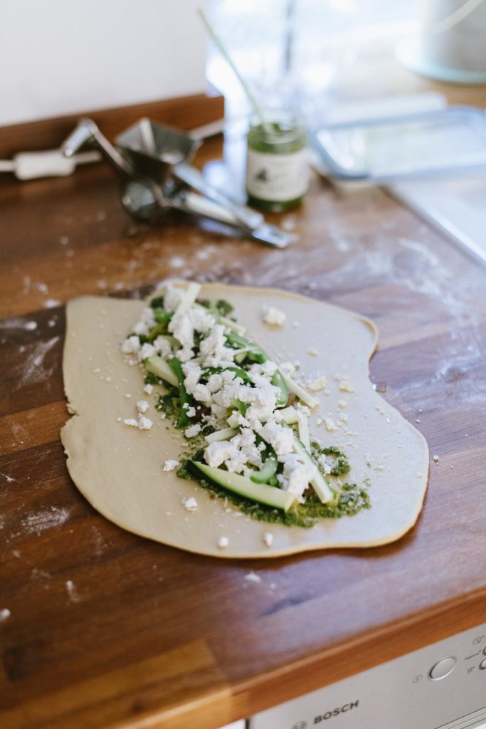 Das vegetarische Stromboli war mit Pesto, Zucchini, grüner Paprika und Schafskäse gefüllt. Das Pesto einfach aufstreichen und die restlichen Zutaten in der Mitte des Teigs aufschichten.