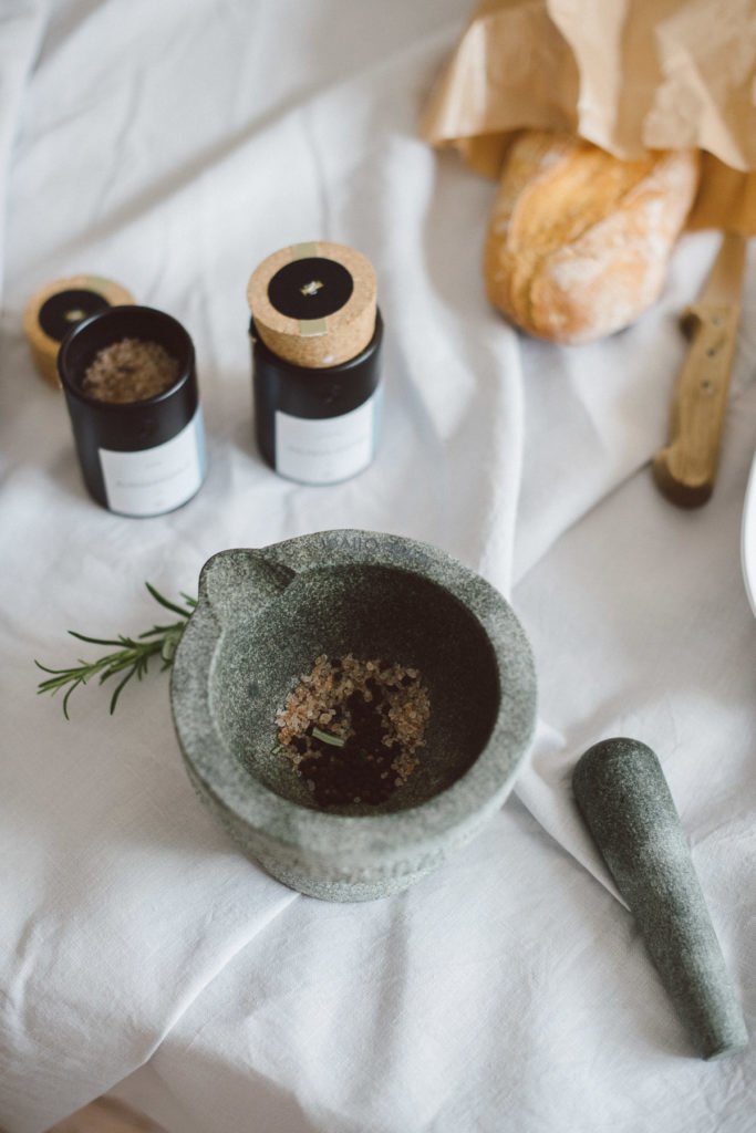 Mörser* // Holzbrett* // Salatbesteck Holz* // Leinenservietten // Servierplatte*