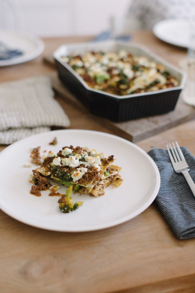 Eine dünne Schicht des Hackfleischragouts in die Auflaufform geben. Lasagneblätter darauf legen. Erneut Ragout darauf verteilen. Brokkoli darauf legen, dann die zweit Schicht Nudelblätter darauf geben.