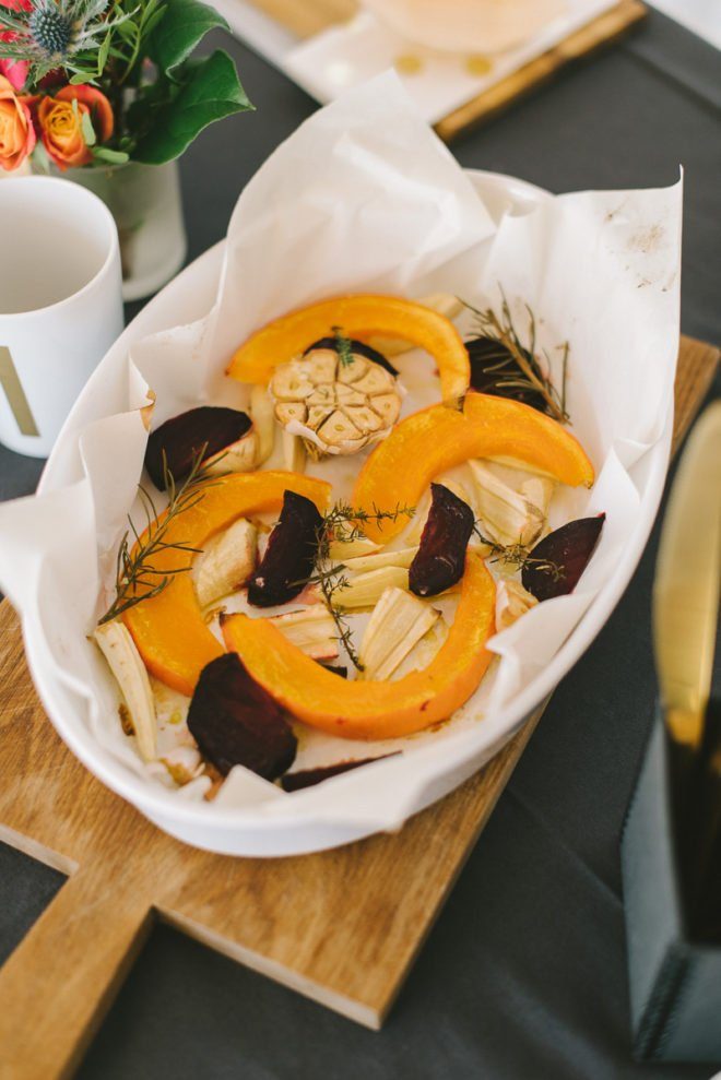 Den Kürbis abwaschen, aufschneiden, entkernen und in ca. 2cm dicke Spalten schneiden. Die Petersilienwurzel schälen, der Längenach halbieren und in ca. 5cm große Stücke schneiden. Die vorgegarte rote Beete wie einen Apfel achteln. Nutzt am besten Messer und Gabel dazu, denn die Gute färbt ganz ordentlich. Rot lackierte Fingernägel sind cool, blassrosa Finger mit fiesen Rändern dann eher weniger…
