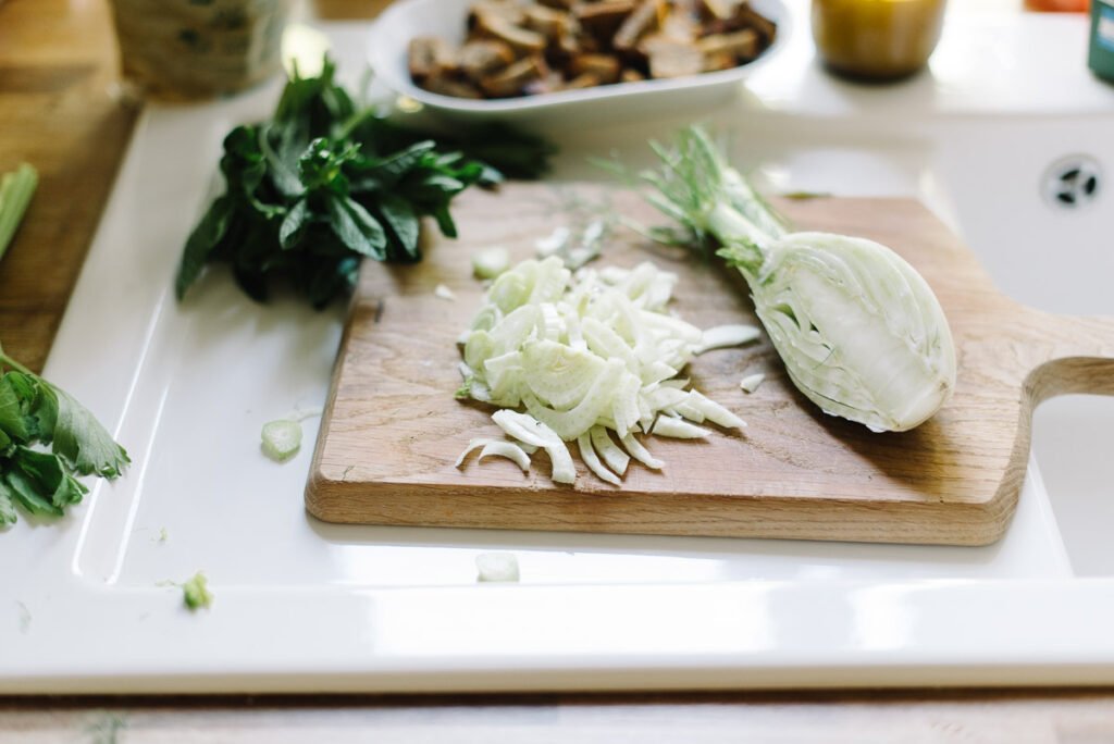 Den Fenchel halbieren und den Strunk heraus schneiden. Die Hälften in dünne Scheiben schneiden und in einer Pfanne mit etwas Olivenöl leicht andünsten. Sie sollten aber noch bissfest sein.
