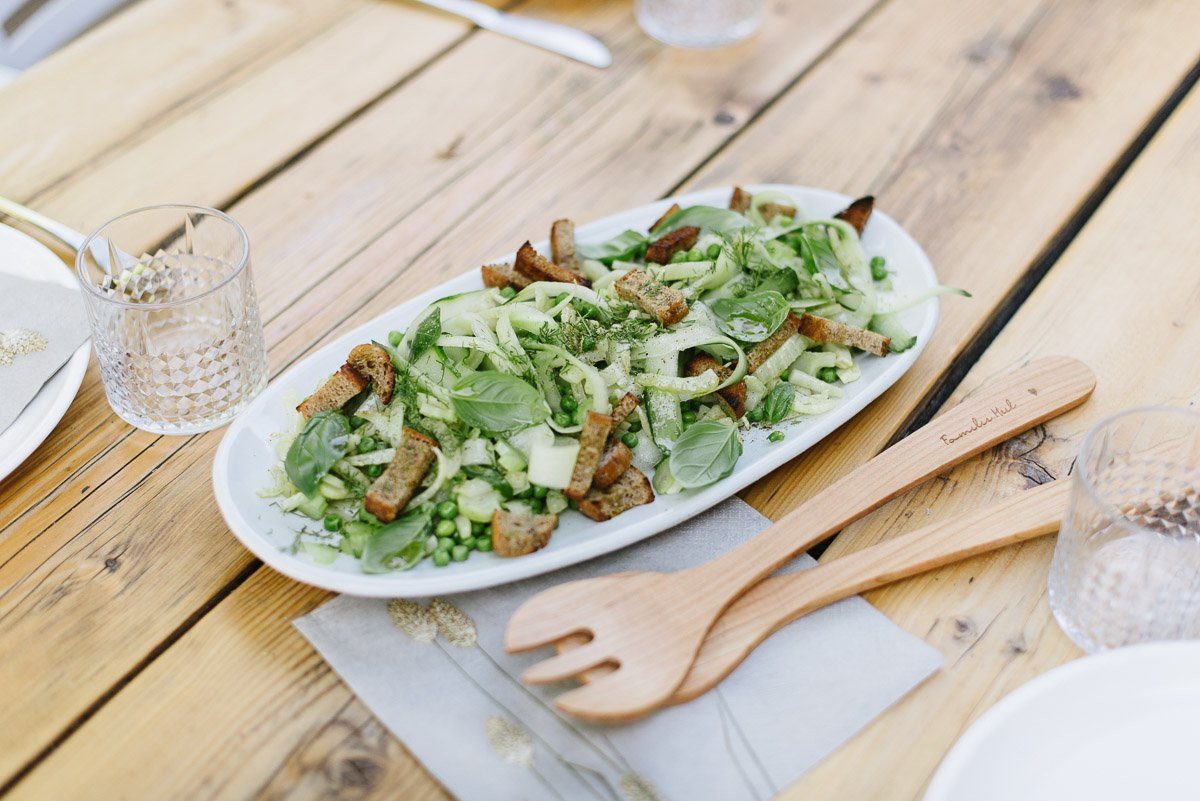 Brotsalat kennen und lieben wir! Die Kombination aus knusprig geröstetem Brot und frischen Zutaten ist einfach unschlagbar. Die Variante Brotsalat mit Melonenkugeln habe ich Euch im letzten Sommer schon empfohlen, heute wird’s hingegen grün!