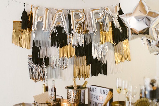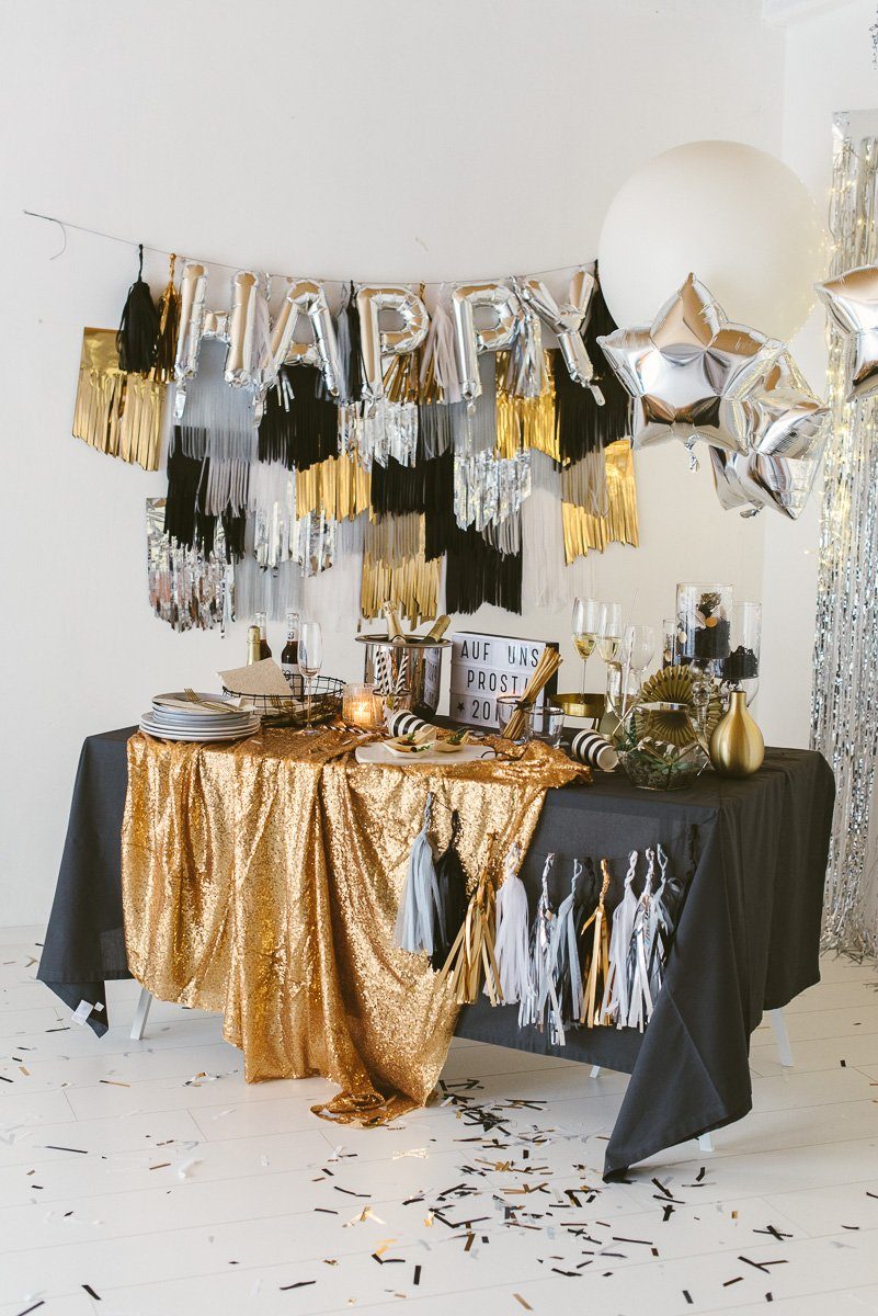 Weniger ist mehr? Nicht an Silvester! Lasst es krachen, auch bei der Deko! Es glitzert auf dem Tisch und an der Wand. Am einfachsten geht das mit Lametta Vorhängen. Sie sind ganz schnell aufgehangen und machen mächtig was her! Einfach vor das Fenster oder an die Türe hängen. Ihr werdet staunen, wie viel Partylaune dadurch entsteht!