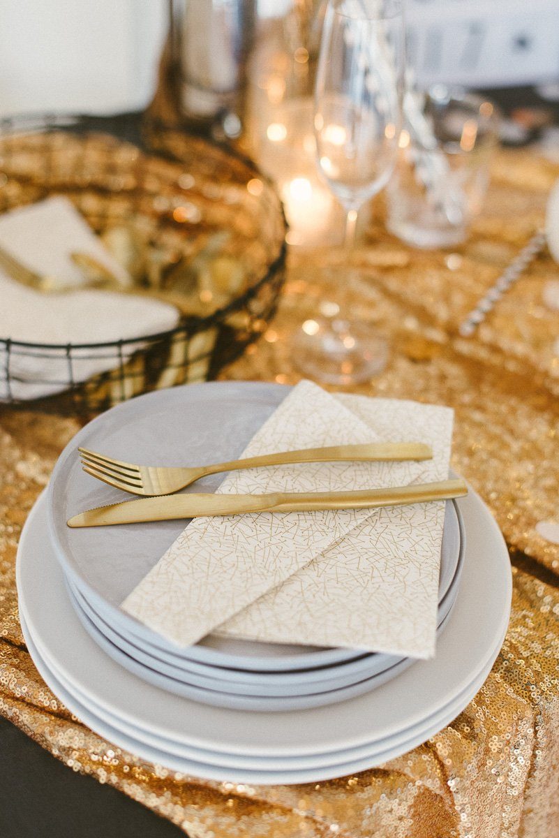 Größter Hingucker ist sicher die goldene Pailettentischdecke! Die lieget ganz lässig über den Tisch und funkelt entspannt vor sich hin. Ein bisschen Konfetti, ja, gerne auch mit etwas Gold, verteilt sich ungezwungen darauf. Die Lightbox erinnert noch mal an den Grund der Feier ;-)