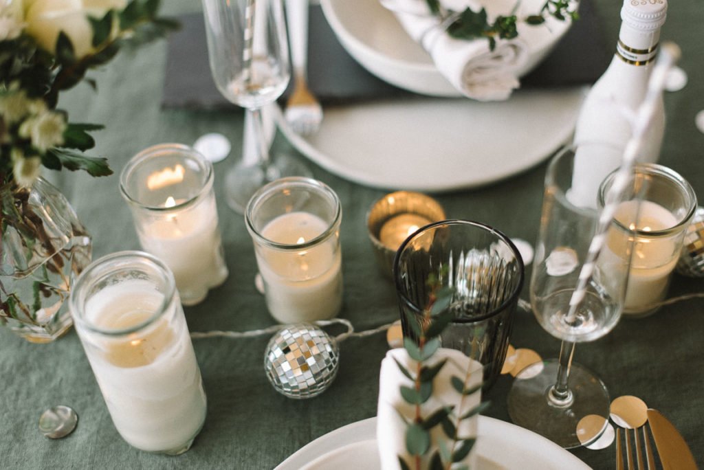 Ein paar Kerzen im Glas dazu, dazwischen die Discokugel Lichterkette und, ganz wichtig, Wunderkerzen!