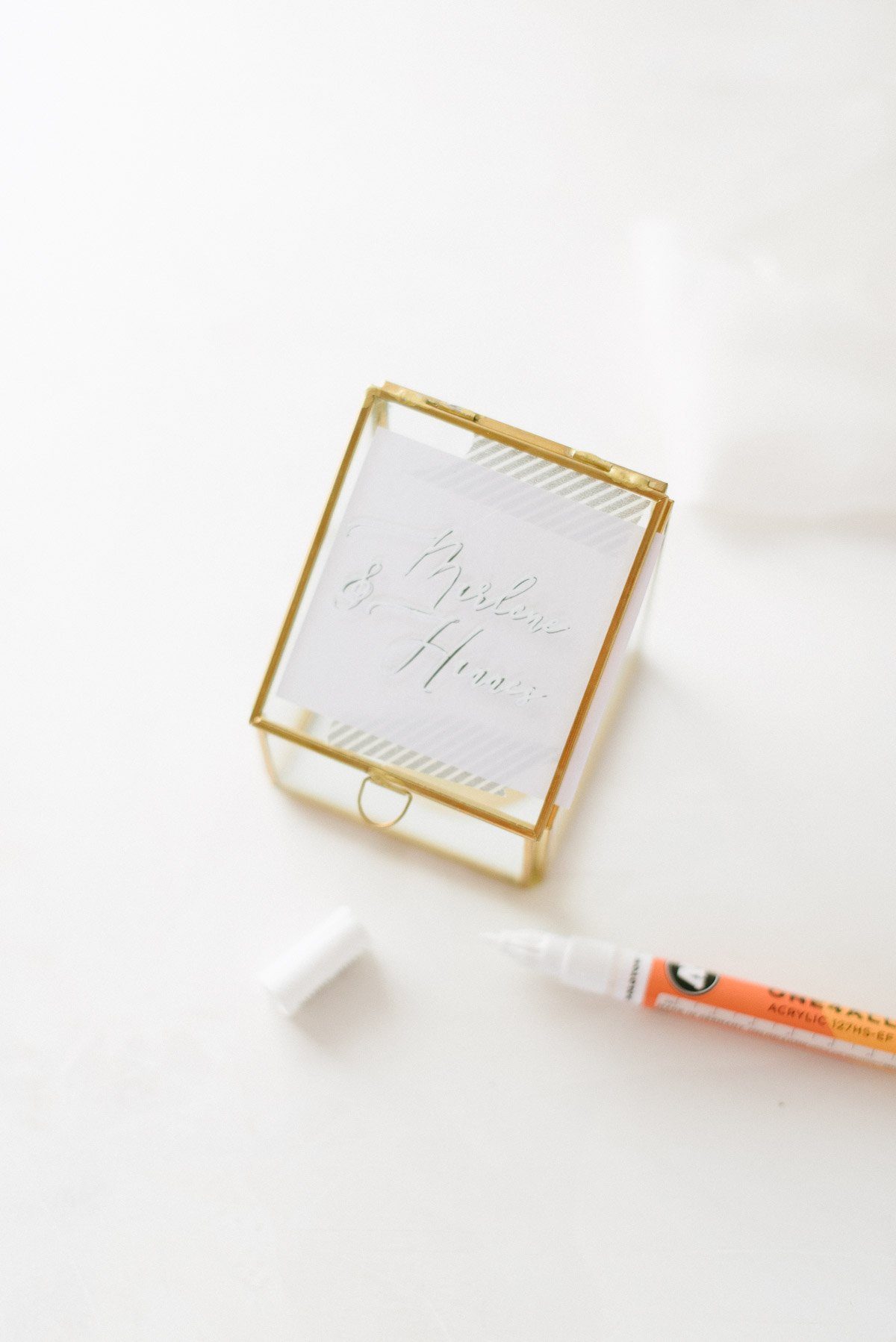 Am besten das Ringkästchen aufklappen und den Deckel nun auf den Tisch legen. Damit liegt es flach und lässt sich leichter beschriften. Wie geübt nun die Namen mit dem Molotow 127-HS Marker ONE4ALL Stift (Affiliate Link) nachschreiben.