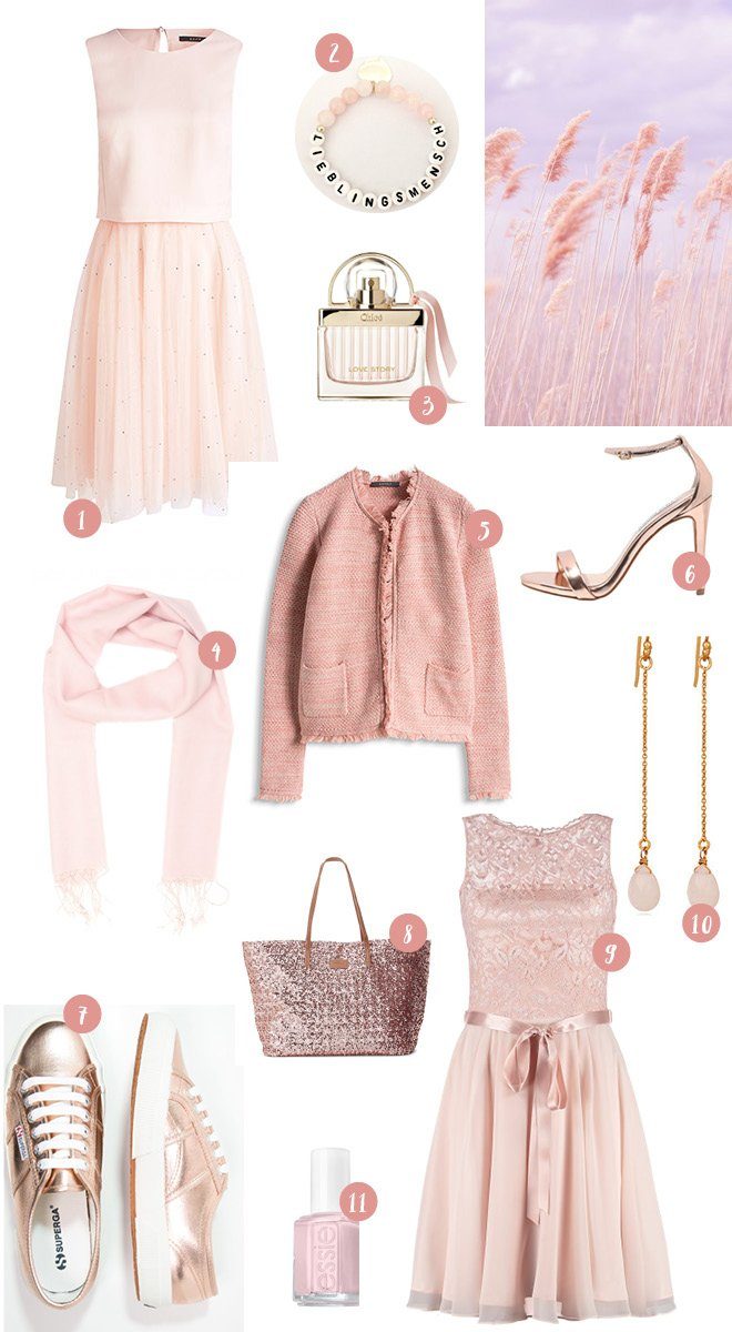 Huch, Ohrringe fast vergessen, dabei sind die Schmuckstücke mit Rosenquarz (10) ausgestattet und schauen so schön aus! Für kühle Abend gehört noch ein Pashmina Schal (4) oder gar ein Blazer mit sanften Fransen (5) in die Tasche. Machen sich auch in der Kirche gut… Jetzt ist auch Zeit für gescheite Schuhe! Rein in die hohen Hacken, denn diese roségoldenen Sandalen (6) sind ein Träumchen!