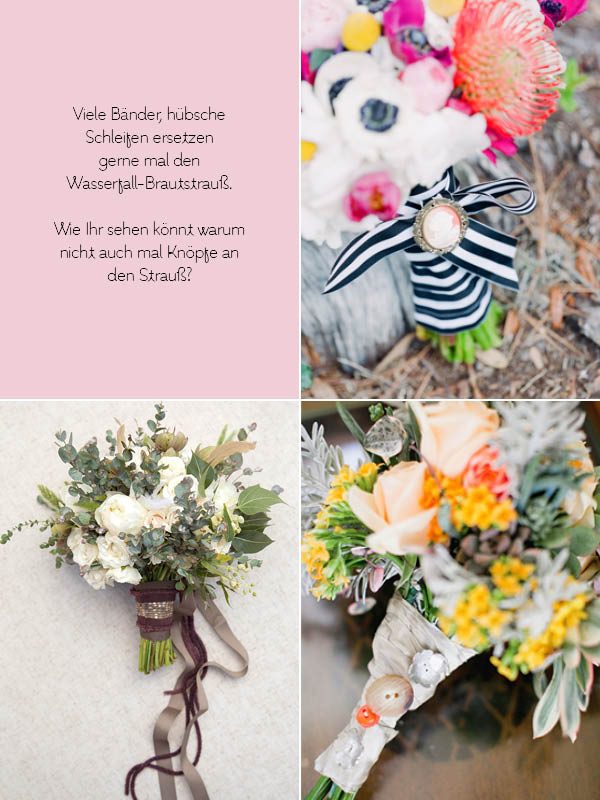 Der Brautstrauß ist eins der wichtigsten Accessoires, das eine Braut überhaupt haben kann. Während die Sträuße in den Siebzigern (schaut mal auf den Hochzeitsfotos Eurer Eltern nach!) eigentlich immer wie ein Friedhofsgesteck aussahen, sind sie heutzutage eher kompakt, aber dennoch üppig. Und außer den Blumen darf auch gerne noch ein weiteres Highlight eine Rolle spielen: Anhänger zum Beispiel, oder schöne Spitzenbänder. Schaut mal was wir für Euch alles gefunden haben. Langes stöbern auf Pinterest hat zu sehr viel Ergebnissen geführt, ein bisschen etwas haben wir für Euch ausgesucht.