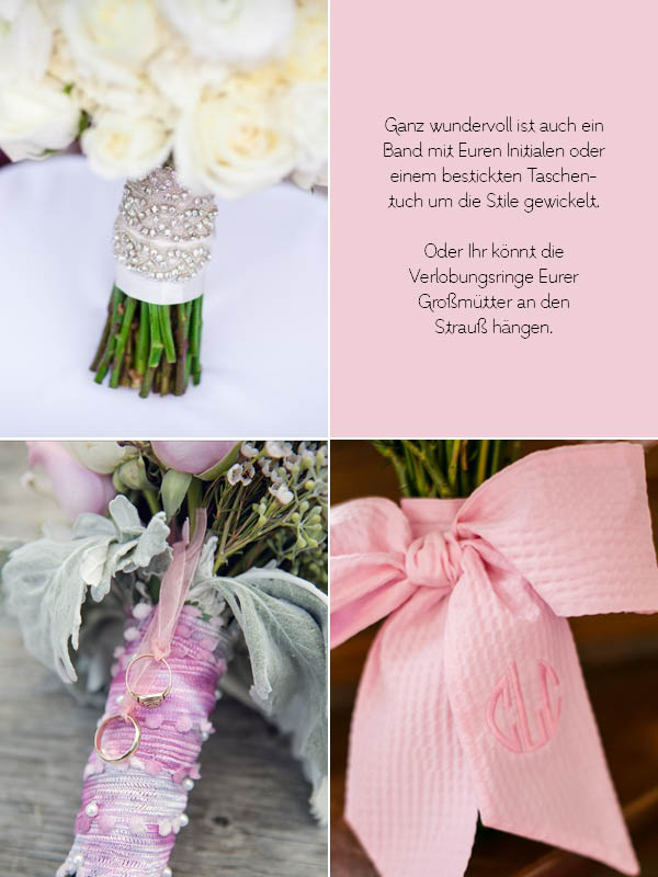 1) Solche Glitzerbänder machen echt viel her, könnt Ihr auch über Etsy beziehen 2) Die Verlobungsringe Eurer Großmütter am Strauß, dann habt Ihr gleich etwas geliehenes oder Altes bei Euch 3) Ein Band mit Initialen bestickt oder ein Spitzentaschentuch der Mama am Strauß befestigt ist auch etwas Besonderes