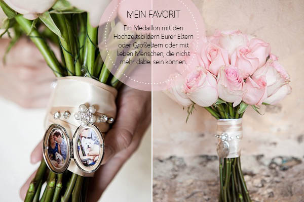Mein Favorit ist emotional und wundervoll, vielleicht auch traurig zugleich. Ein Medaillon am Brautstrauß mit Hochzeitsbildern Eurer Großeltern oder Eltern oder mit lieben Menschen, die Euch schon verlassen haben und an Eurem Hochzeitstag nicht mehr dabei sein können. Eine schöne Geste um allen zu zeigen, wie wichtig sie Euch sind.
