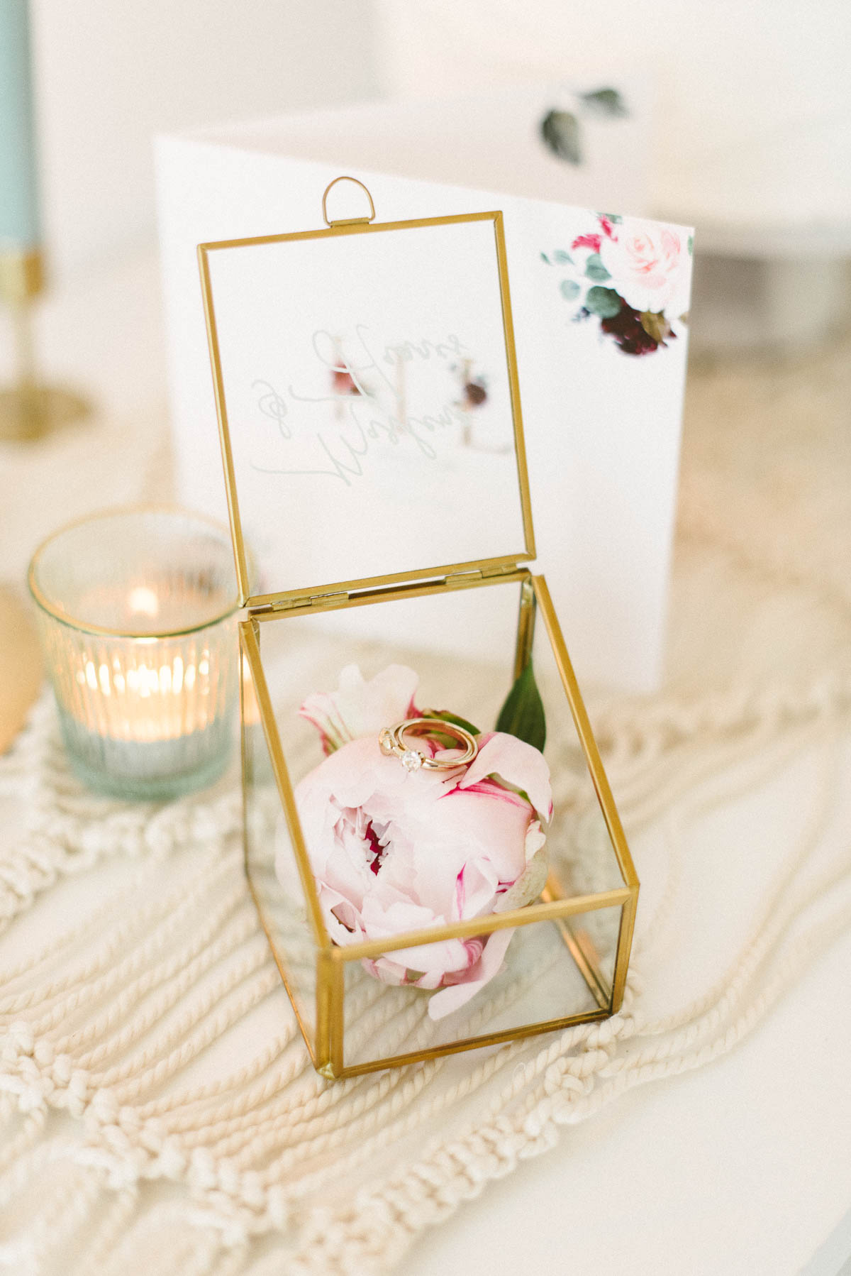 Eine einzelne Blüte sieht in den goldenen Glasterrarien hübsch aus. Solche kleinen Arrangements lassen sich überall in der Location verteilen und sorgen für einen einheitlichen Look! Selbst als Ringkissen bieten sich die Blüten an. Schaut mal, wie schön die Ringe in dem goldenen Terrarium mit Deckel aussehen!