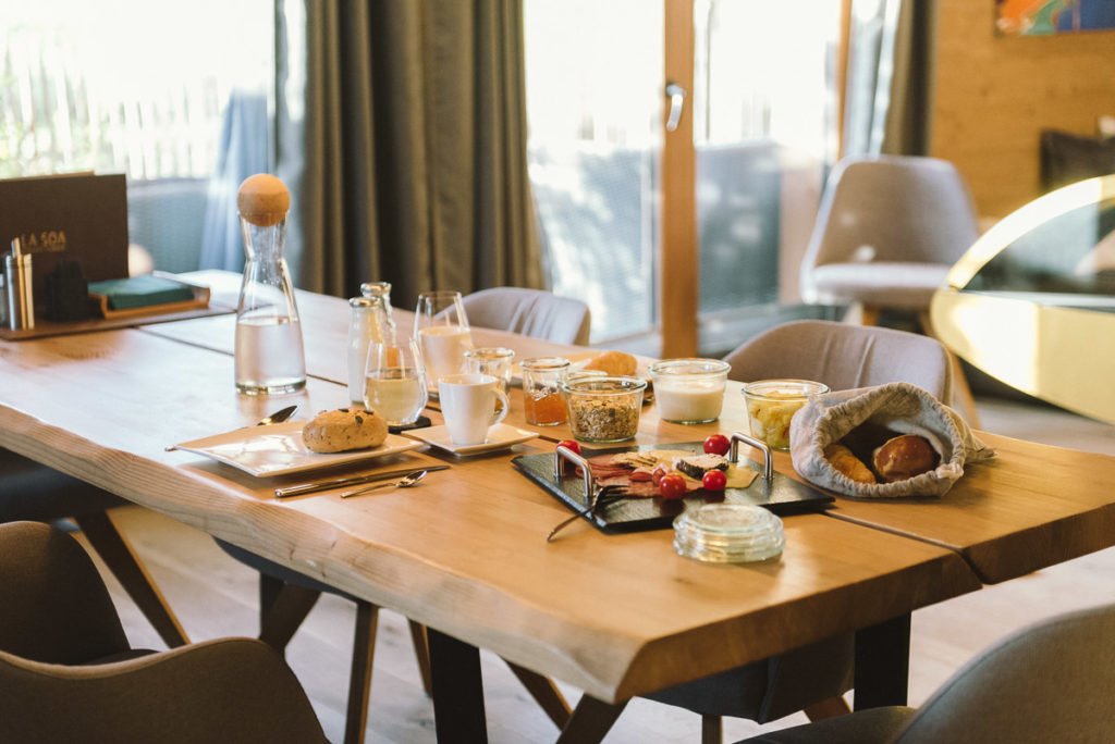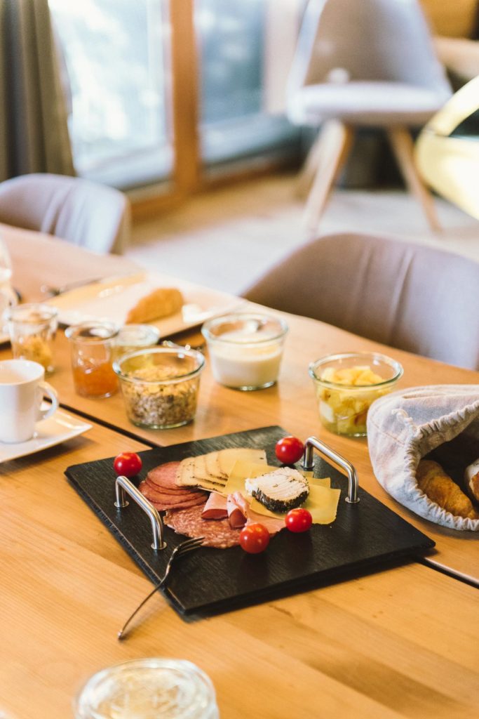 Das Frühstück wird auf Wunsch ins Chalet gebracht. Eine Holzkiste mit regionalen Leckereien wartet am Morgen vor der Türe.