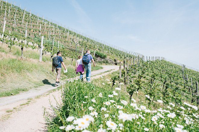 Freitagnachmittag sind wir angereist und haben den Tag mit einer kleinen Wanderung durch die Weinberge samt Picknick ausklingen lassen. Von Ortszentrum aus war das Weingut Andreas Männle unser erstes Ziel. Bei einer kleinen Weinprobe entschieden wir uns für einen den Spätburgunder Rosé Kabinett trocken 2015, der gekühlt in unserem Rucksack Platz fand. Nach einem kurzen, aber steilen Aufstieg näherten wir uns Schloss Stauffenberg. Doch halt, die herrliche Liege mit Blick auf die Weinberge muss erst ausprobiert werden. Ah! Was für ein perfekter Ort für ein kleines Picknick samt lecker Rosé!