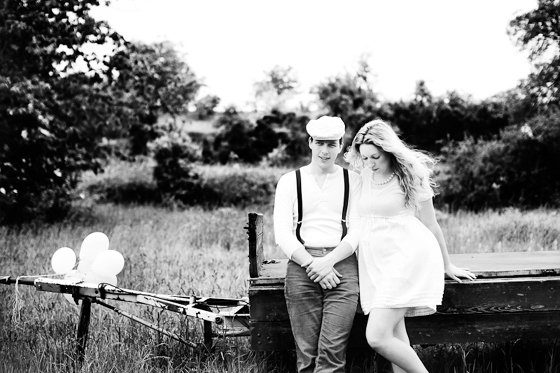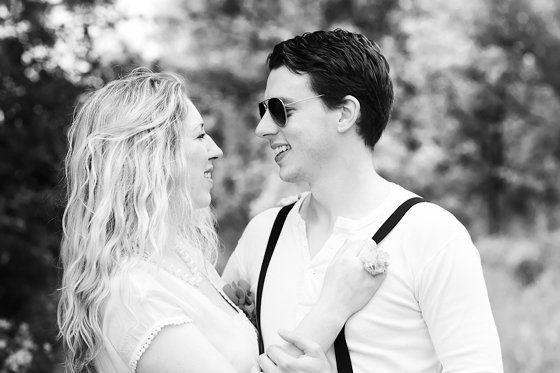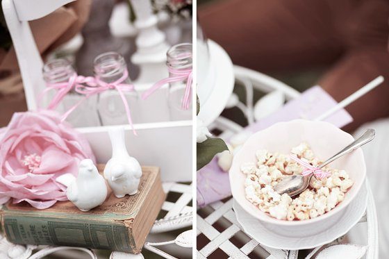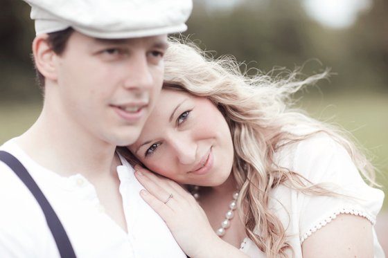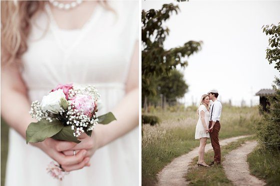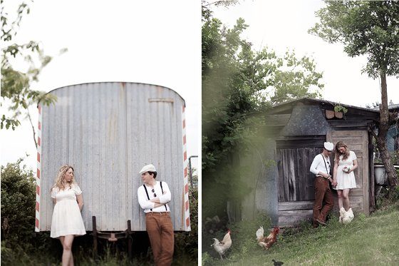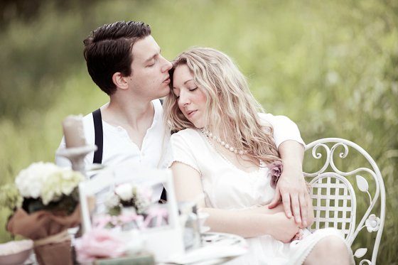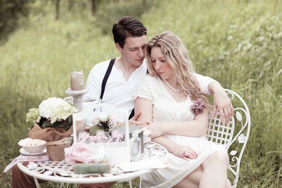 “Das Engagementshooting war eine Überraschung für Alain. Er liebt alte Zeiten, er liebt Popcorn und er liebt mich :) Würde zu gerne wissen, in welcher Reihenfolge er diesen Satz geschrieben hätte. Zu meinem Geburtstag wünschte ich mir von ihm ein Bistroset. Eigentlich extra für dieses Shooting, das konnte er zu diesem Zeitpunkt jedoch noch nicht wissen. Ich hatte genaue Vorstellungen. Vintage musste es sein. An meinem Geburtstag jedoch fotografierte ich eine andere Hochzeit und war schon früh auf den Beinen. Meine Geschenke mussten auf mich warten. Im Laufe des Tages kam eine MMS, auf dem Bild zu erkennen: unser Haus im Rohbau, durch die Fensteröffnung sah man die Umrandung des Bistrosets und ich wusste sofort mein Mann kennt und liebt mich. Die Requisiten für das Shooting waren alle zusammen und es war perfekt. Auch das Shooting selbst war herzallerliebst. Patrick war als Fotograf zwar da, aber irgendwie waren wir doch für uns… Alain et Janine. Es fühlte sich wie eine Generalprobe für unsre Hochzeit im Juli an… alles soll unter einem Thema stehen… ‘Liebevolles für die Liebe.’ Dinge, die uns persönlich wichtig sind schmücken unseren Tag. Die meisten Dekoelemente sind Handarbeit und mit viel Liebe zum Detail am Entstehen. “Es lebe Vintage” wird wohl manch ein Gast sagen. Und zurecht, denn auch ich denke: es lebe Vintage, es die Liebe und es lebe das Brautpaar…”