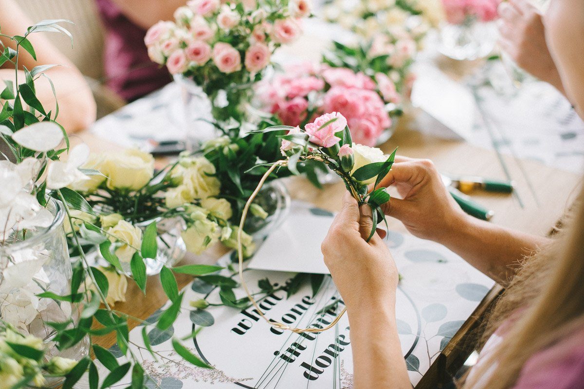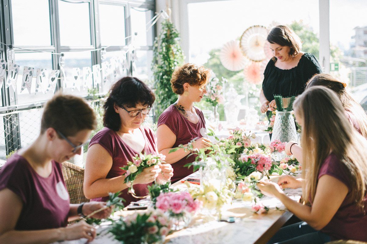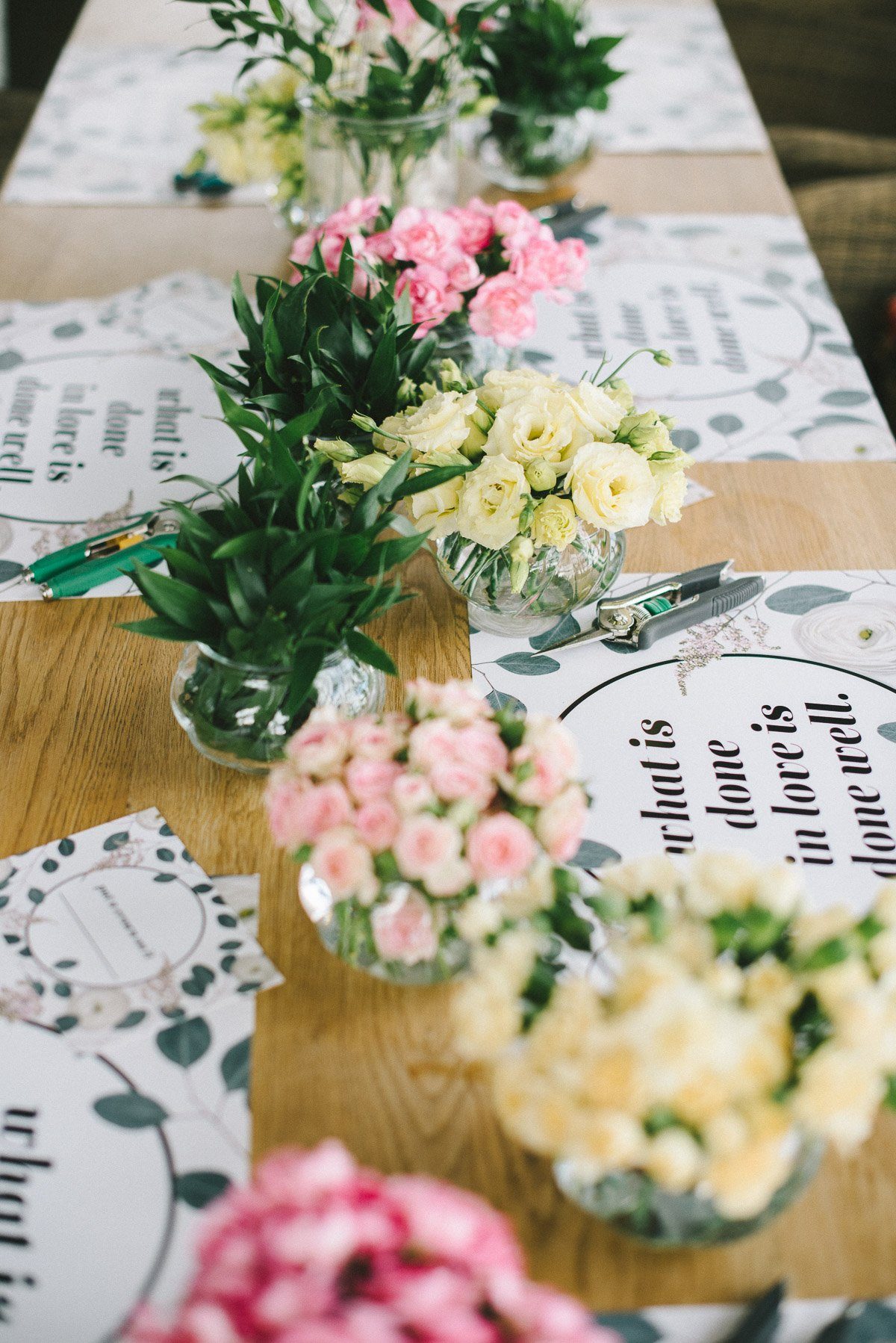 Blumenstylistin Anna Kochanow brachte nicht nur den entzückenden Blumenschmuck für den Tisch mit, sie führte die Damenrunde ebenfalls in die Kunst des Blumenbindens ein. Falls Ihr nun schon denkt ‘Oh, das würden wir auch gerne machen’, dann schaut mal fix bei der Plansey Blumenparty rein! Diese Box kann man sich einfach per Post zusenden lassen und hat somit alles, um trendige Blumenkränze zu kreieren. Ein tolles DIY, das auch für Babypartys oder Geburtstage passt!