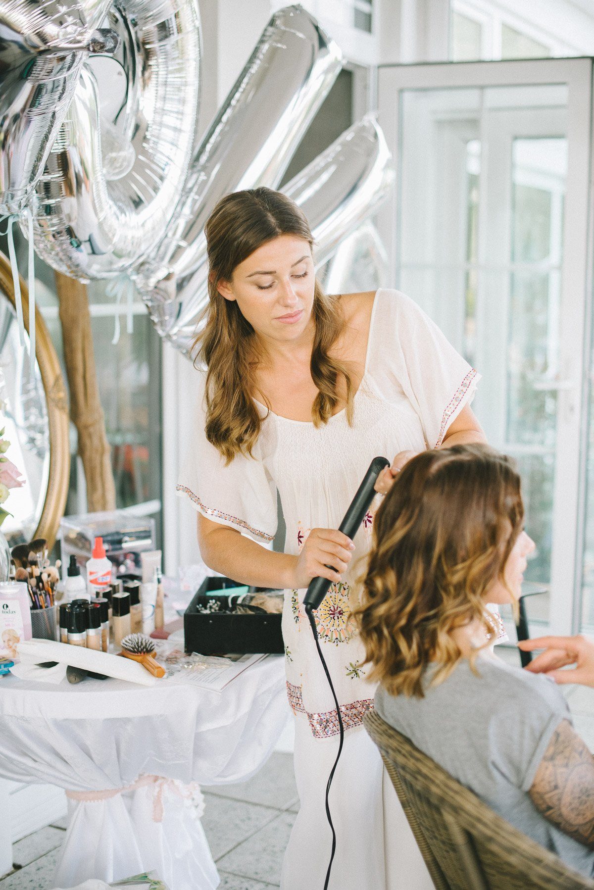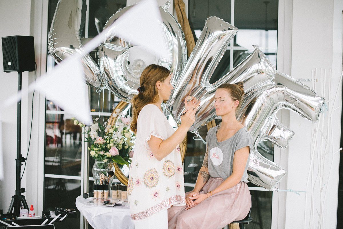 Während die Ladys fleißig Blumen banden, wurde die zukünftige Braut von Make-up Artist Jennifer Bätz verwöhnt. Der Alltagsdutt wich sanften Wellen und die Augen strahlten nach einem tollen Make-up mit sensationellen Wimpern. Sarah strahlte zurecht! Auch die Mädels erhielten ein Fresh-up ihres Stylings und waren bereit für das Fotoshootings auf der Dachterrasse des Restaurants.