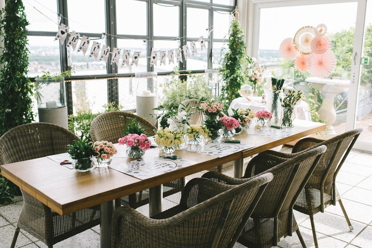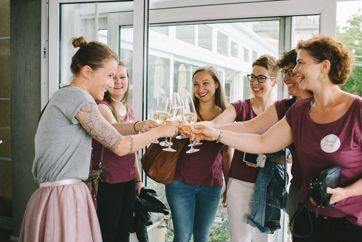 Zusammen mit einem Team kreativer und professioneller Dienstleister erwarteten wir Braut Sarah und ihre Mädels im Wintergarten des Restaurants Schöne Aussicht in Frankfurt. Die ahnungslose Braut wurde mit diesem Event überrascht und brauchte ein paar Minuten um zu realisieren, was gerade geschah. Mit einem Begrüßungssekt war das Eis aber schnell gebrochen und die Stimmung war locker fröhlich.
