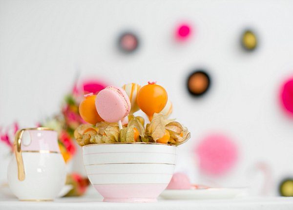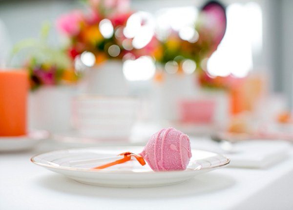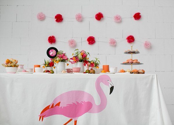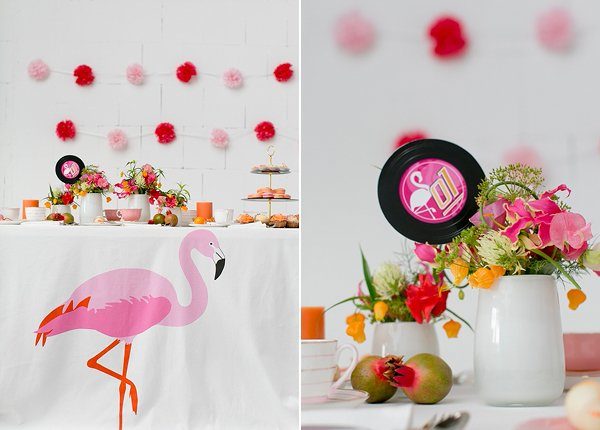 Für die Tischdeko wurde schlichtes altes Porzellan in den Farben darkpink, rosa und weiß herausgesucht, alles original aus den 50er Jahren. Dazu kam eine Etagere aus Schallplatten , schlichte weiße Vasen und Blumen in Tönen der Farbpalette. Die Blumen sollten richtig tropisch anmuten, um das Flamingo-Thema inhaltlich zu unterstützen. Die Tischdecke wurde aus einem Ikea-Stoff selbst genäht. Die Cake-Pops und Cupcakes sind ebenfalls in der knalligen Farbpalette gehalten.