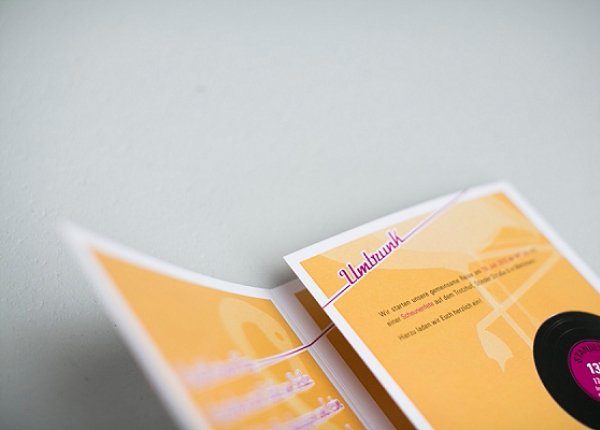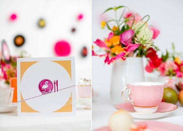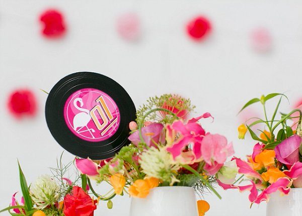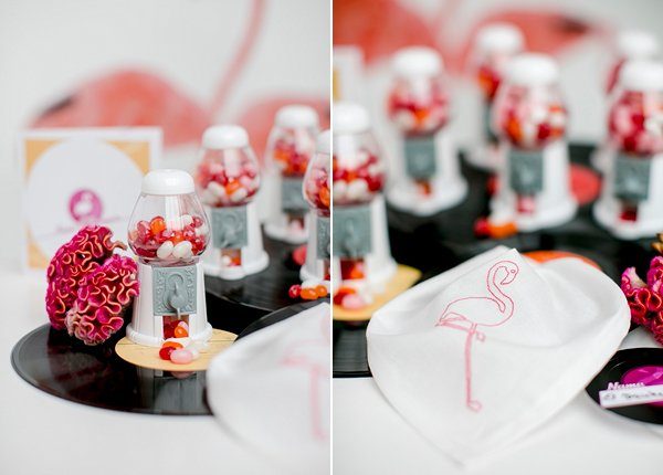 Papeterie: Einladung, Menükarte, Tischnummer und die Platzkarten spielen mit dem Thema Schallplatte und Flamingos und sind modern und klar gehalten. Eine Tischordnung wurde aus alten Schallplatten und kleinen Aufklebern aus der Papeterie-Serie gestaltet, indem jede Schallplatte als Tisch mit Nummer dient und die Gäste „drum herum“ gesetzt werden. Als Geschenk finden die Gäste kleine Kaugummi-Automaten vor, die mit farblich passenden Jelly Beans befüllt wurden. Sehr süß und erhältlich bei van harte.