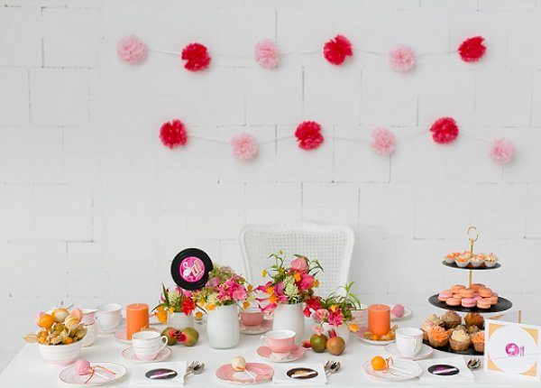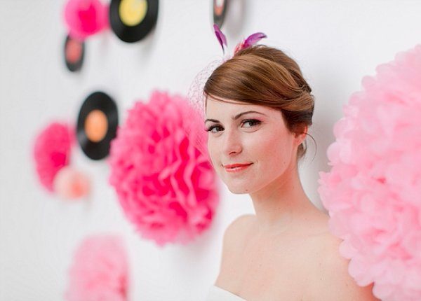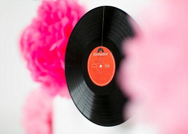 Kuckt Euch mal den Hintergrund an: alte Schallplatten (gibts bei ebay oder auf dem Flohmarkt für wenig Geld), dazwischen ein paar Pompoms und Wabenbälle. Fertig ist das Werk, das sich auch prima als Hintergrund für einen Fotobooth eignet.