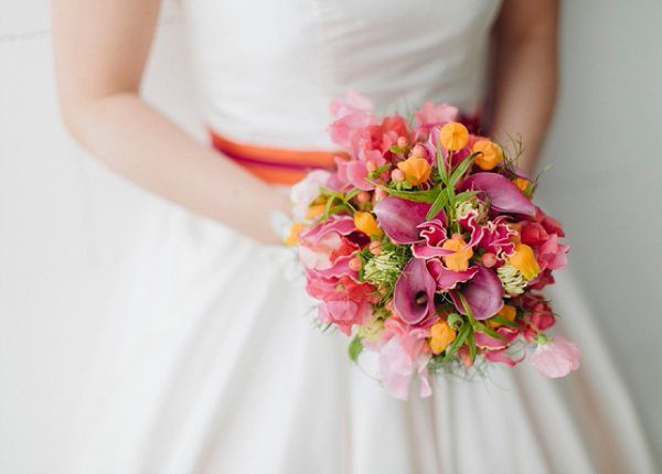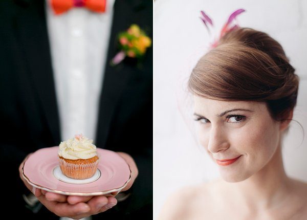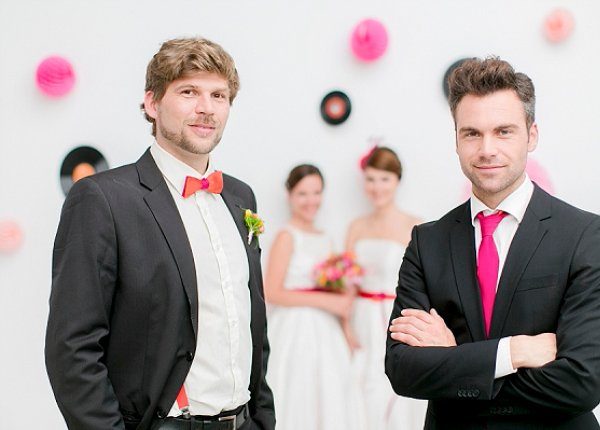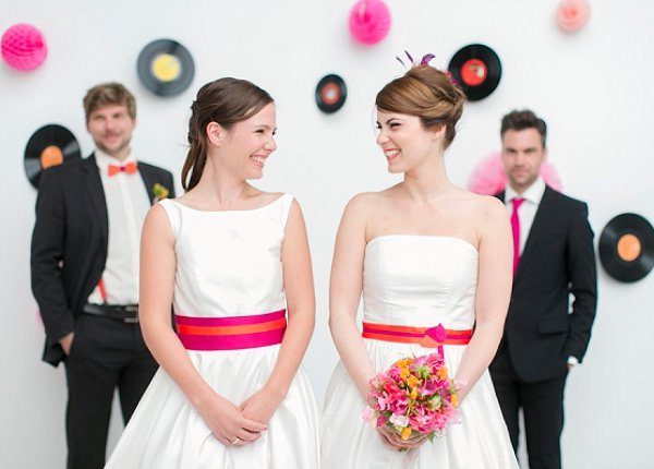Die Brautkleider sind von noni und wurden von noni zu Ehren des rockigen Themas mit Tüllunterröcken in pink und orange, passenden Gürteln und Schuhen ergänzt ergänzt. Die Herren wurden mit passender Fliege bzw. Krawatte und Hosenträgern ausgestattet. Die süßen Haar-Fascinators wurden von Jazzafine handgefertigt.