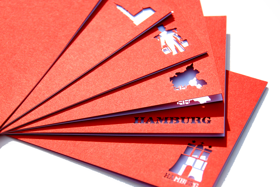 Besonder schön finden wir die Idee mit den Stadtmotiven. Die Karten könnte man als Hochzeitseinladung abwandeln. Sie sind mit den Wahrzeichen der Städte gelasert, z.B. dem Hamburger Wappen, dem Michel und dem Umriss des Bundeslandes. Auf den weißen Einlegeblättern können dann Informationen für die Gäste gedruckt werden.