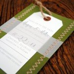 Hochformatig und gefaltet. Der Einlager mit den Informationen wird vom Seidenband gehalten. Fotos via minted.