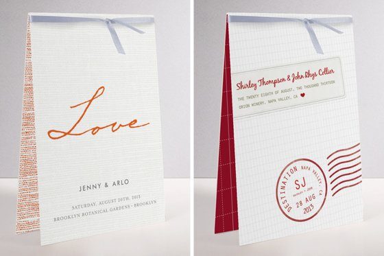 Hochformatig und gefaltet. Der Einlager mit den Informationen wird vom Seidenband gehalten. Fotos via minted.