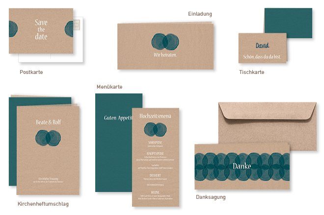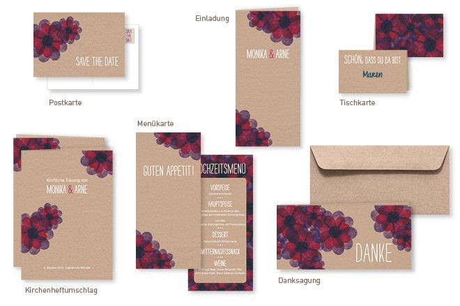 Bei diesen Beispielen wurde das Papier mit farbigen Motiven und einer weißen Schrift kombiniert. Von der Safe-The-Date Karte über die Einladung, Menü- und Platzkarte bis hin zum Dankesanschreiben ist alles dabei. Sonderwünsche werden bei In Sachen Papier ebenfalls gerne entgegen genommen und individuell umgesetzt.
