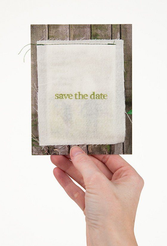 Wir werden sicher ein paar weitere Ideen zu Save the Date Karten sammeln. Diese hier mal zuerst, weil sie uns einfach super gefallen haben und auch recht einfach nachzubasteln ist. Der Hintergrund bildet eine Karte mit Holzmuster (hier kommt natürlich jeds andere auch in Frage), dann folgt das Foto des Paares mit dem Termin und ggf. der Location und darüber wurde ein Stückchen Stoff genäht, das auch noch bestempelt wurde. Simple but elegant. So mögen wir das!