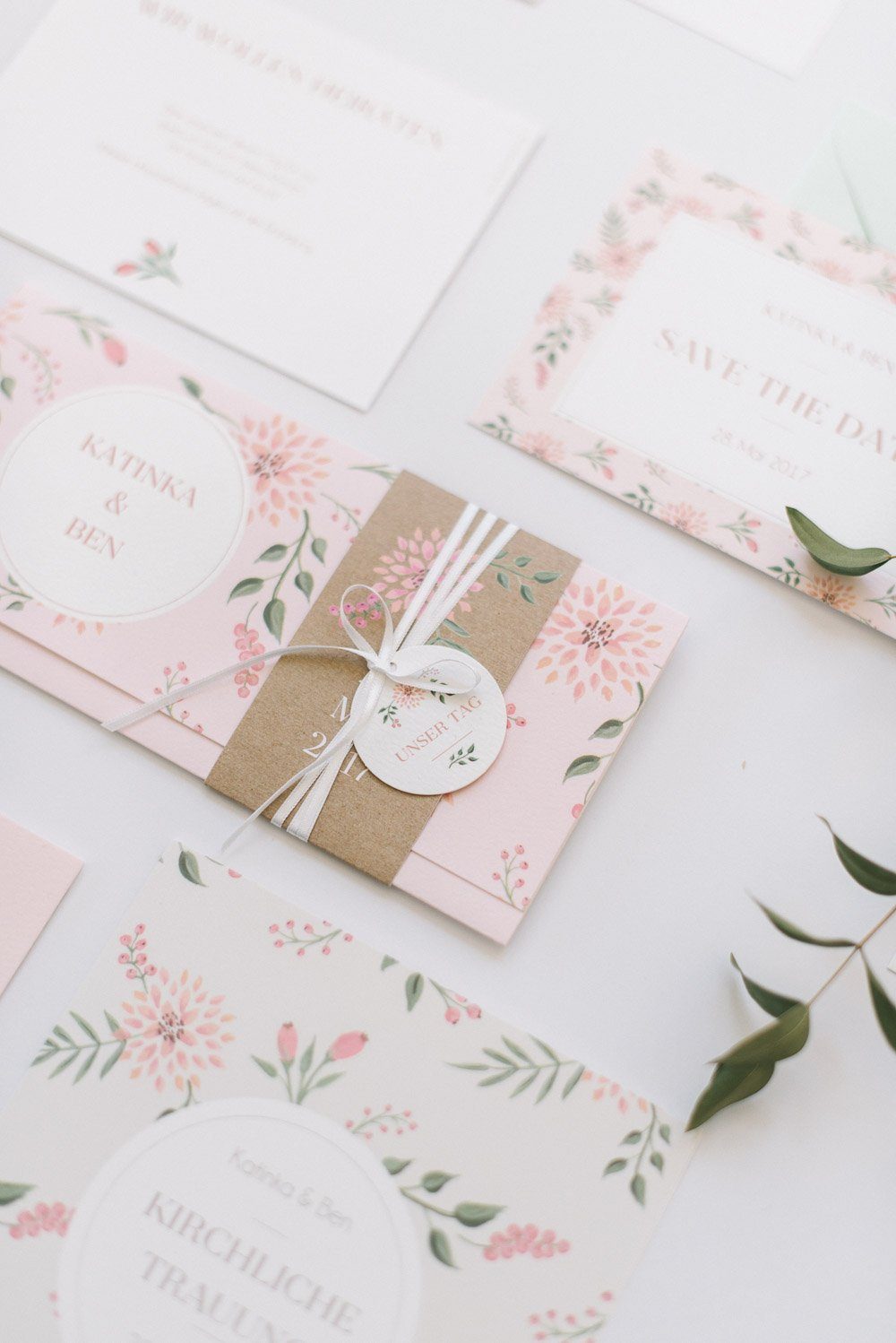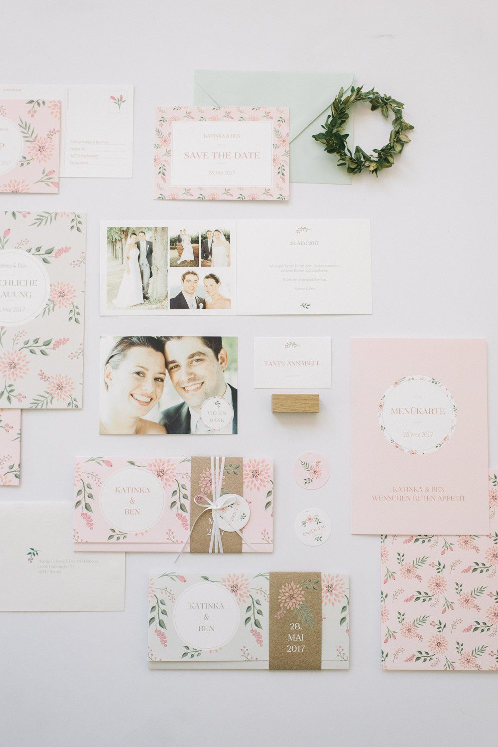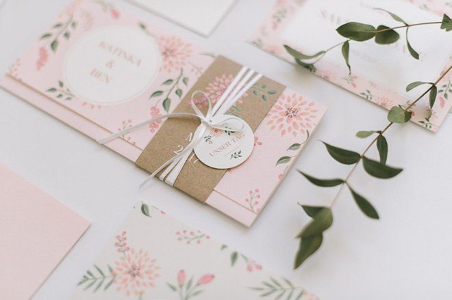 Neben der Einladungskarte gibt es auch weitere Bestandteile, um Eurer Papeterie einen einheitlichen Look zu geben: Antwortkaren, Namensschilder, Menükarten, Kirchenhefte, Geschenkeaufkleber, Anhänger oder sogar Etiketten für Euren Hochzeitswein.