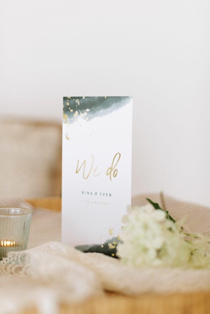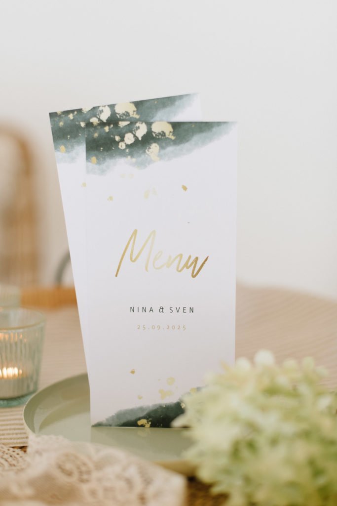 Wir haben uns bei allen Bestandteilen für den, wie wir sagen würden, Golden Greenery Look entschieden. Waldgrünes Aquarell mit goldenen Farbtupfern. Daher: Golden Greenery Hochzeits-Papeterie von Kaartje2go.