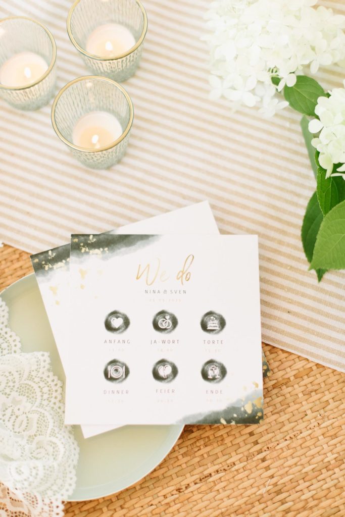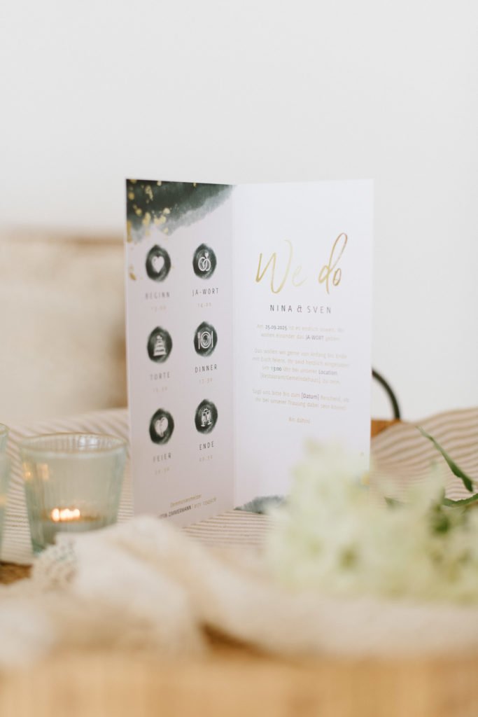 Die offiziellen Einladungen sollten spätestens ein halbes Jahr vor eurer Hochzeit eure Gäste erreichen. Mit Menü-Karte und Programmablauf könnt ihr euch etwas mehr Zeit lassen.