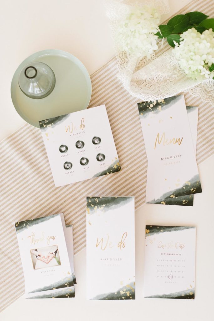 Außer den Save-the-Date Karten, haben wir zwei Einladung-Varianten, eine Menü-Karte und eine Danksagungskarte drucken lassen. Das sind die Basics und die zeigen wir euch jetzt!