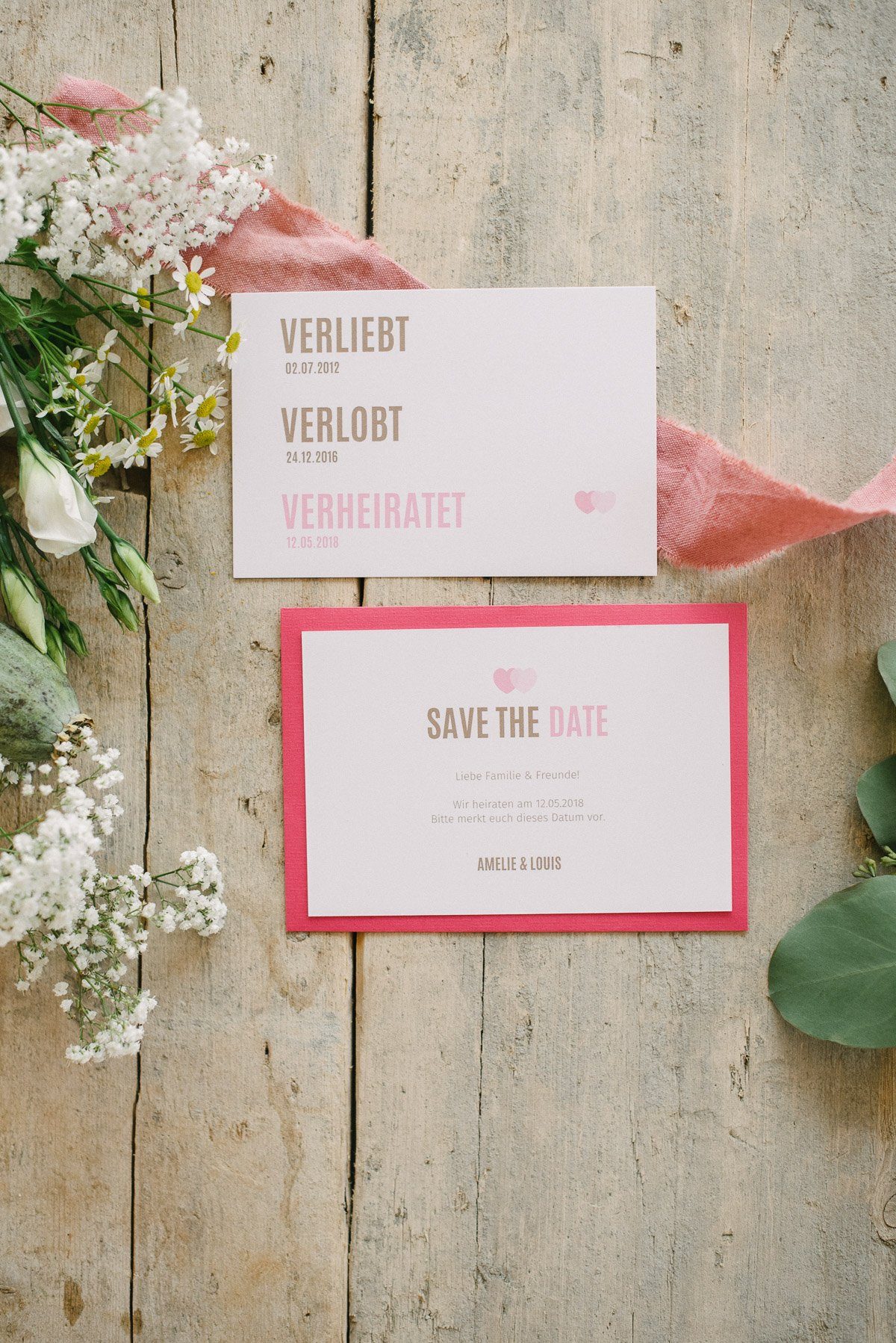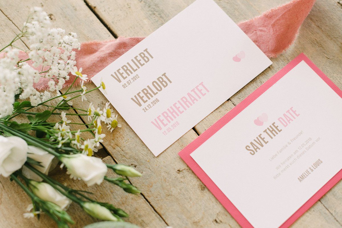 Egal für welches Design Ihr Euch entscheidet, die Save-the-Date Karte sollte zu Euch passen und Euch gefallen. Wird Eure Einladung im gleichen Stil gestaltet sein, zieht sich der rote Faden durch das gesamte Konzept.