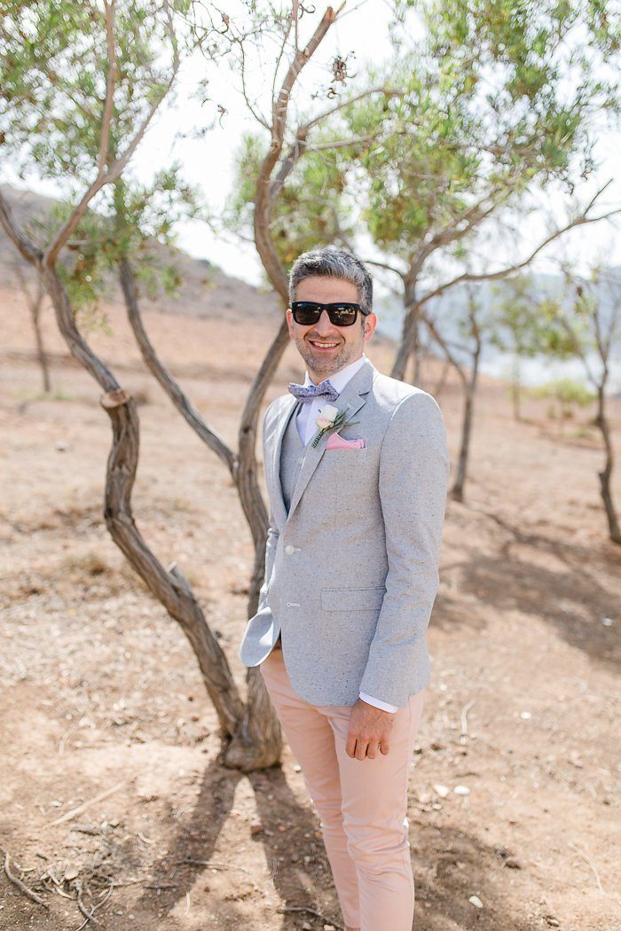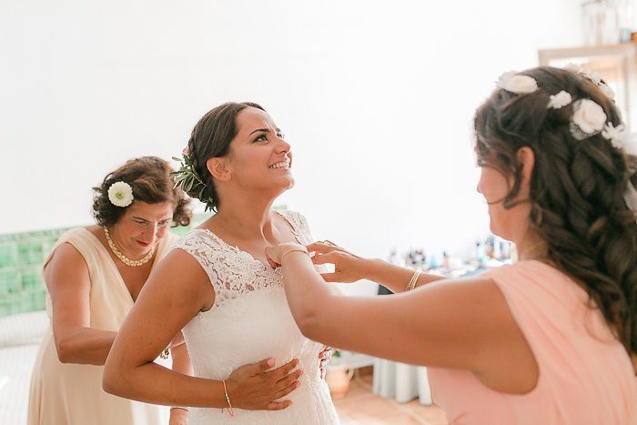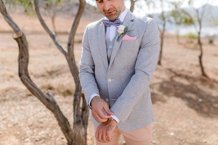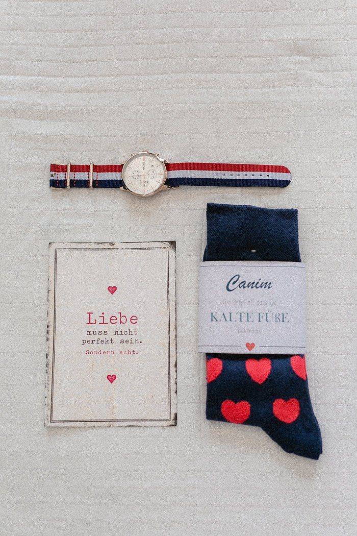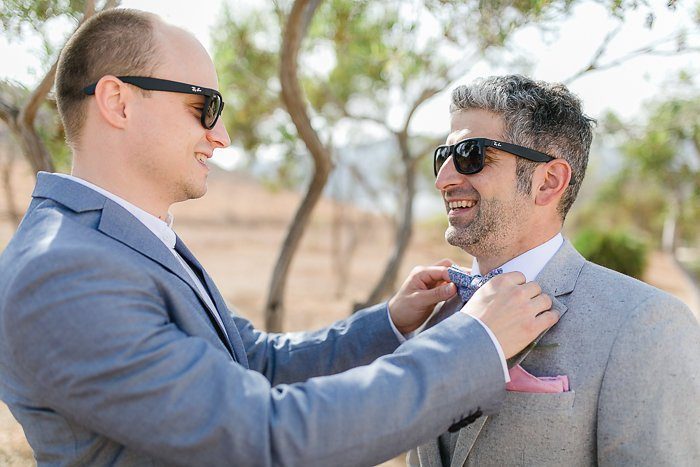 Das gemeinsame Styling genossen alle sehr – gekrönt natürlich vom Anziehen des Brautkleids. Die Jungs hatten nicht minder Spaß und machten sich in lockerer Atmosphäre draußen schick. Gemusterte Fliege und Sonnenbrille – die Trauung kann kommen. Darf ich Euren Augenmerk noch mal auf die Chino – Sakko Kombination lenken? Fashion Statement!