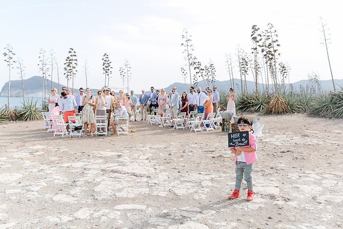 Was für Anblick! Nicht nur Braut die nach dem süßen Ankündigungsschild einzieht, sondern auch die gesamte Szenerie am Meer. Die Gäste wohnen der liebevoll emotionalen Trauung auf lässigen Klappstühlen bei und fiebern mit dem Brautpaar mit.